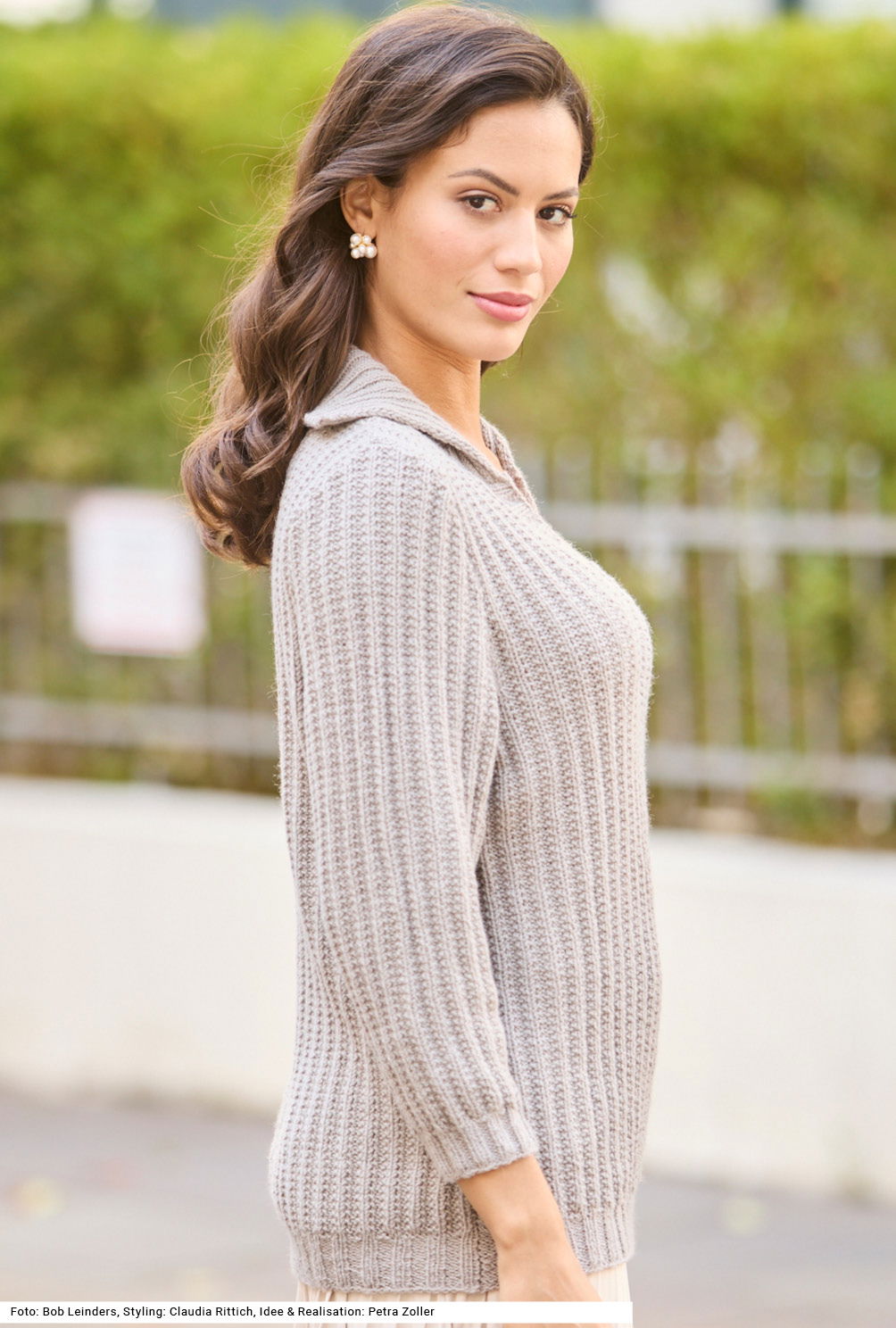 Dieser Pullover zeigt, wie ein aufs Wesentliche reduziertes Design je nach Kombination mit Rock oder Jeans, mal elegant, mal sportlich wirken kann. Insbesondere, wenn hochwertige Materialien zum Einsatz kommen, wie das feine Garn aus reiner Alpakawolle. Das falsche Patentmuster (es werden nur rechte und linke Maschen gestrickt) gibt dem Look eine klare Struktur, der sportive Polokragen unterstreicht dies besonders. Der Kragen, die Poloblende und alle Bündchen werden im 1/1-Rippenmuster gearbeitet. Eine Anleitung steht für die Größen 38/40, 42/44 und 46/48 zur Verfügung.