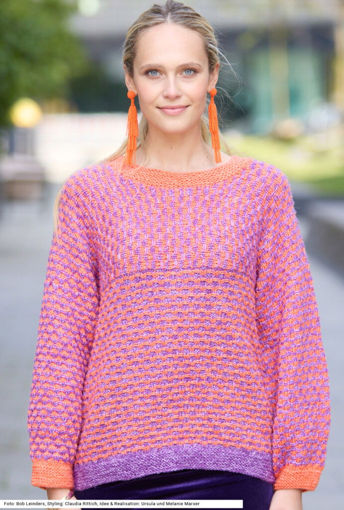 Das Raffinierte an diesem Pulli sind nicht nur die beiden Strickrichtungen – zunächst die Ärmel und die Passe quer, dann der Körper von oben nach unten angestrickt –, sondern das an sich einfache Hebemaschenmuster, dessen Farben einfach getauscht werden. Die Bündchen und auch die Blende um den weiten, runden Halsausschnitt werden kraus rechts mal in der einen, mal in der anderen Farbe gearbeitet. Der Schnitt ist insgesamt weit und lässig. Als Garn empfehlen wir ein Schurwollgarn mit Kaschmir-Beimischung. Die Anleitung dazu gibt es für die Größen 36/38, 40/42 und 44/46.