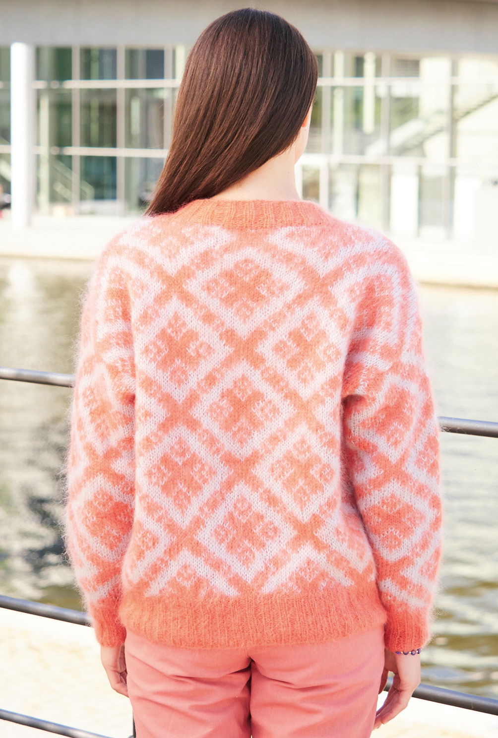 Sabrina Strickjournal Pulli mit Rautenmuster in Korallenrot und Hellgrau