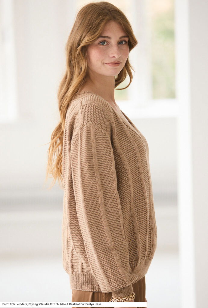 Dieser bequem oversized geschnittene Pullover mit V-Ausschnitt lässt sich perfekt kombinieren – mal mit kleinem Tuch, mal mit einer Bluse darunter oder einfach ganz ohne, um das Dekolleté zu zeigen. Und der dezente Mustermix aus glatten und krausen Längsstreifen trägt ebenfalls dazu bei, dass dein Outfit charmant aufgewertet wird. Dazu ein Garn aus reiner Schurwolle mit einer leichten Melange in den Farben. Der breite Streifen in der Vorderteilmitte läuft um den V-Ausschnitt und auch über den rückwärtigen Halsausschnitt weiter. Die Bündchen haben ein Rippenmuster. Eine Anleitung gibts für die Größen 36/38, 40/42 und 44/46.