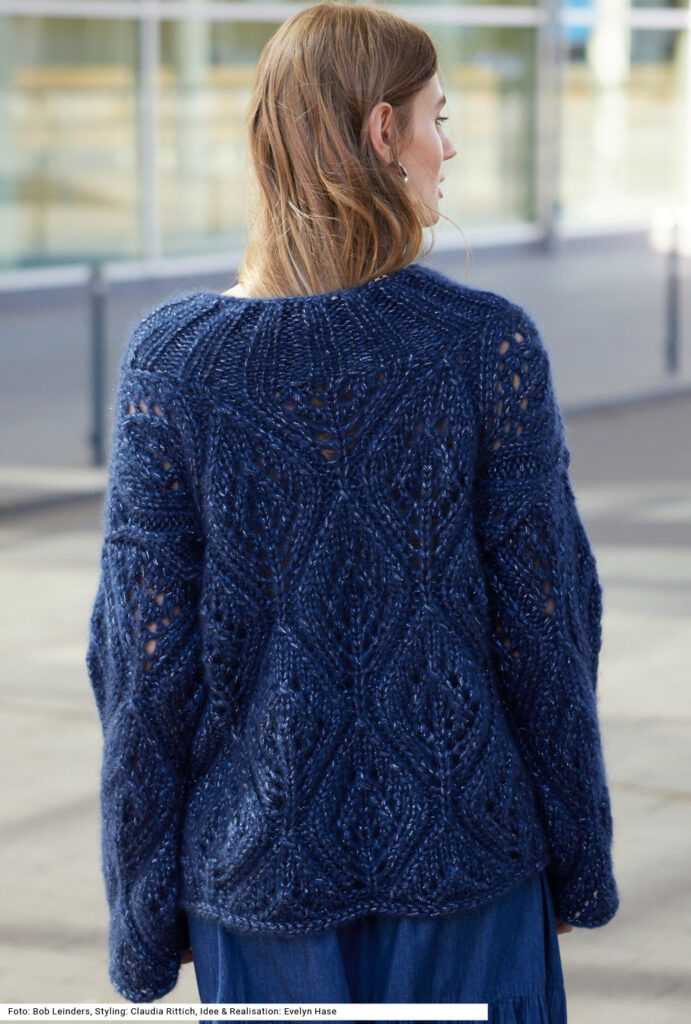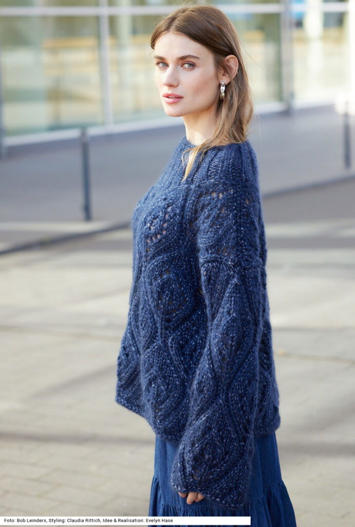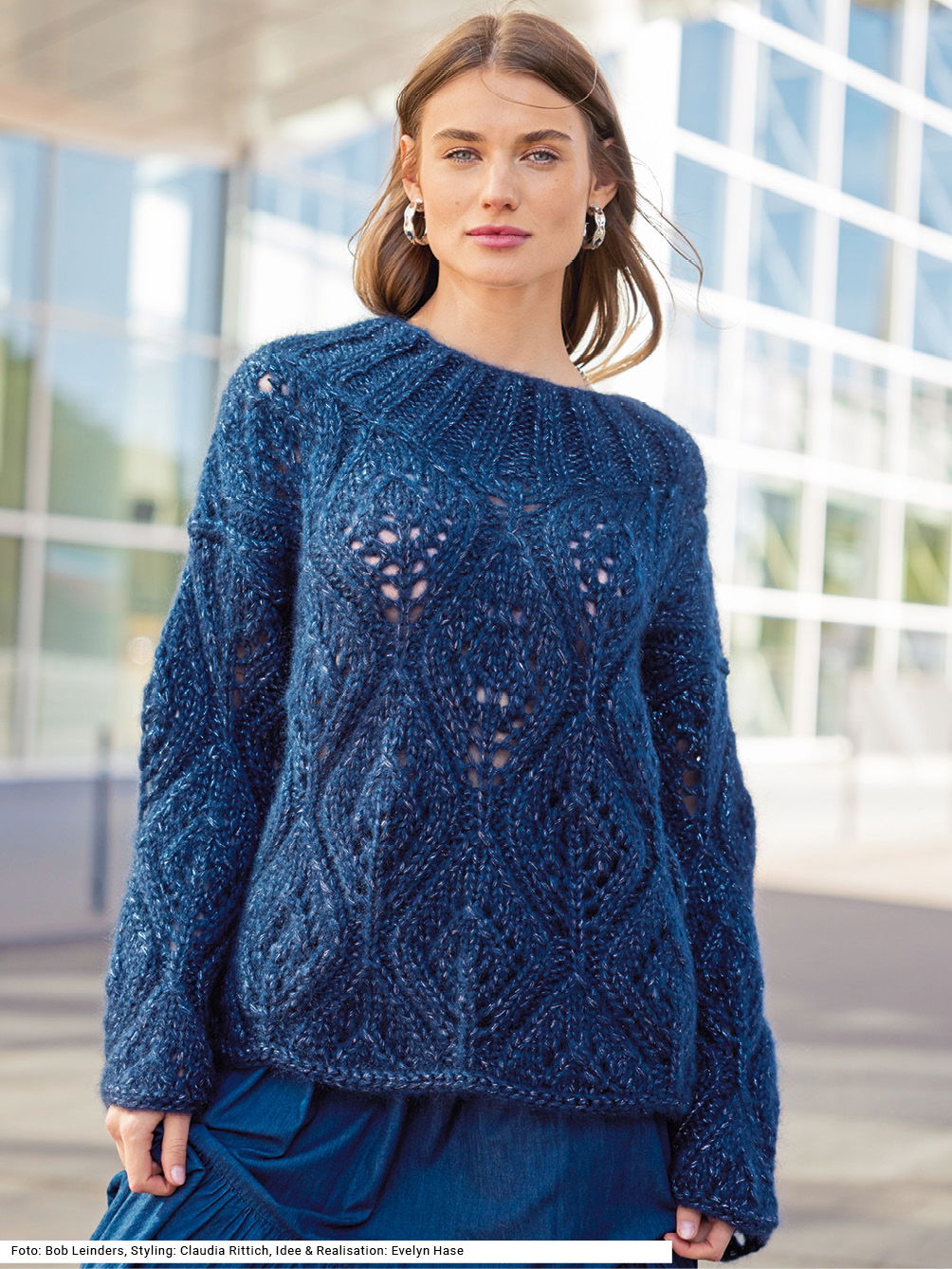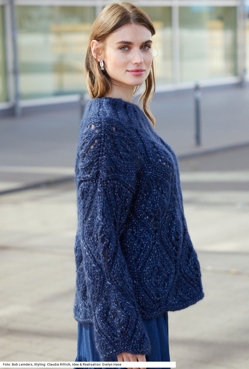 Der Pulli mit großflächigem Blatt-Ajourmuster ist nicht nur mollig warm, sondern begeistert schon beim Stricken. Beim Ajourmuster ist Konzentration gefragt, mit der genauen Strickschrift gelingt es aber gut. An den Seiten wird bis zum Armausschnitt kraus rechts gearbeitet; die breite Blende um den weiten Halsausschnitt ist mit Rippen gestrickt. Das flauschige Garn mit Glitzereffekt ist dank des hohen Mohair- und Seidenanteils (mit wenig Synthikbeimischung) zudem sehr kuschelig. Dazu ein Oversize-Schnitt, der viel Bewegungsfreiheit gibt. Die Anleitung kann für die Größen 40/42, 44/46 und 48/50 downgeloadet werden.