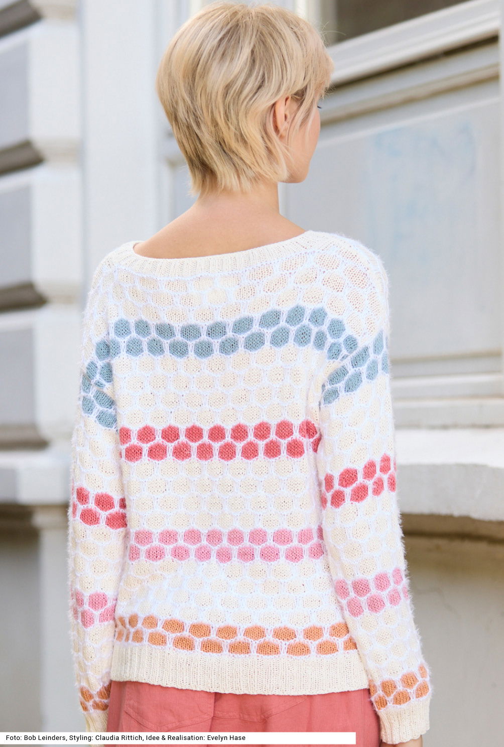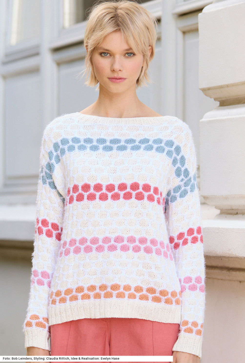 Der bequem geschnittene Pullover im Hebemaschenmuster, das an Bienenwaben erinnert, bringt sommerlichen Schwung in die Garderobe. Das liegt nicht unwesentlich auch an den beiden Garnen aus Viskose und Leinen bzw. Baumwolle und Polyacryl, die eine besondere Haptik bieten. Vier bunte Farben bilden einen fröhlichen Kontrast zur Hauptfarbe in kontrastierender Unifarbe. Die Waben entstehen durch hochgehobene Maschen. Alle Bündchen und die Blende am flachen, runden Halsausschnitt werden im 2/2-Rippenmuster gestrickt. Gerade eingesetzte Ärmel lassen sich einfach einnähen in die überfallenden Schultern. Die Anleitung dazu gibts für die Größen 36/38, 40/42 und 44/46.