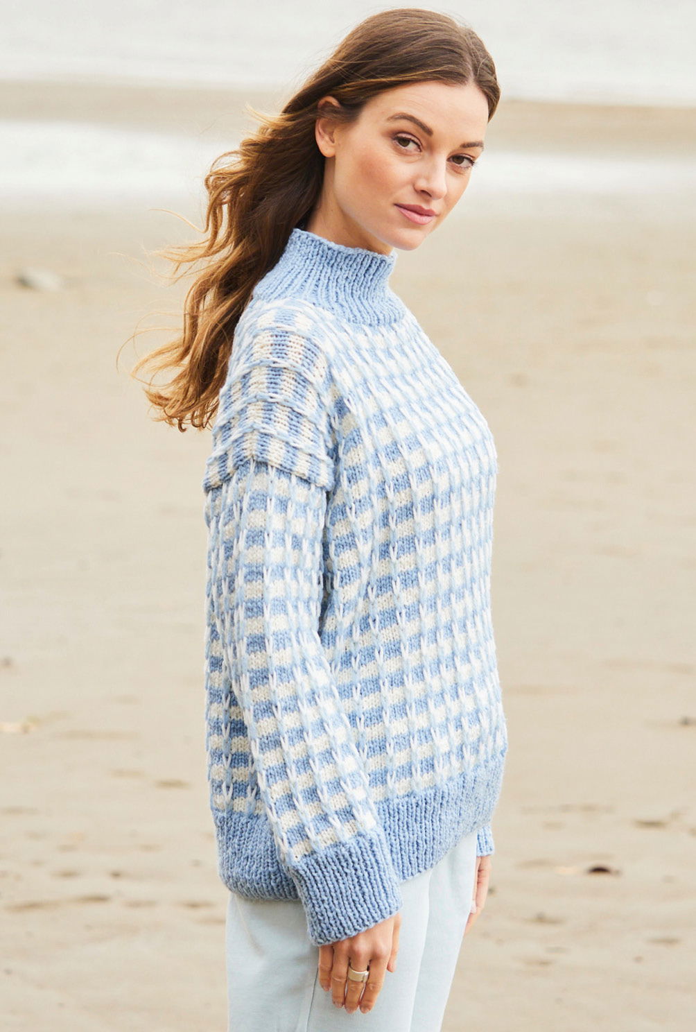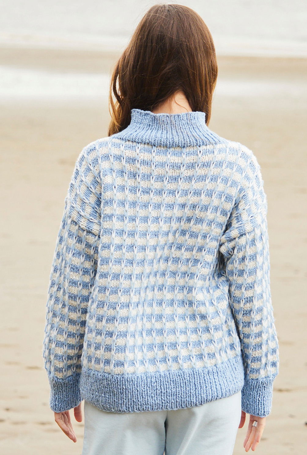 We love Stehkragen – Der «kleine Bruder» des Rollkragens ist kuschlig warm, bietet aber trotzdem genug Raum ohne einzuengen. Für alle, die es gemütlich lieben. Das traumhafte Hebemaschenmuster und die lockere Passform mit dem geraden Schnitt machen dieses Teil zu einem Lieblingsprojekt. Durch die Hebemaschen entsteht ein eindrucksvolles, zweifarbiges Muster. Aber keine Sorge, das ist wirklich überhaupt nicht schwer und wird in der Anleitung und der Strickschrift genau beschrieben. Die einzelnen Teile werden von unten nach oben gestrickt und zusammengenäht. der Kragen wird zum Schluss angestrickt. In der Anleitung findest du die Größen 38/40, 44 und 48/50.