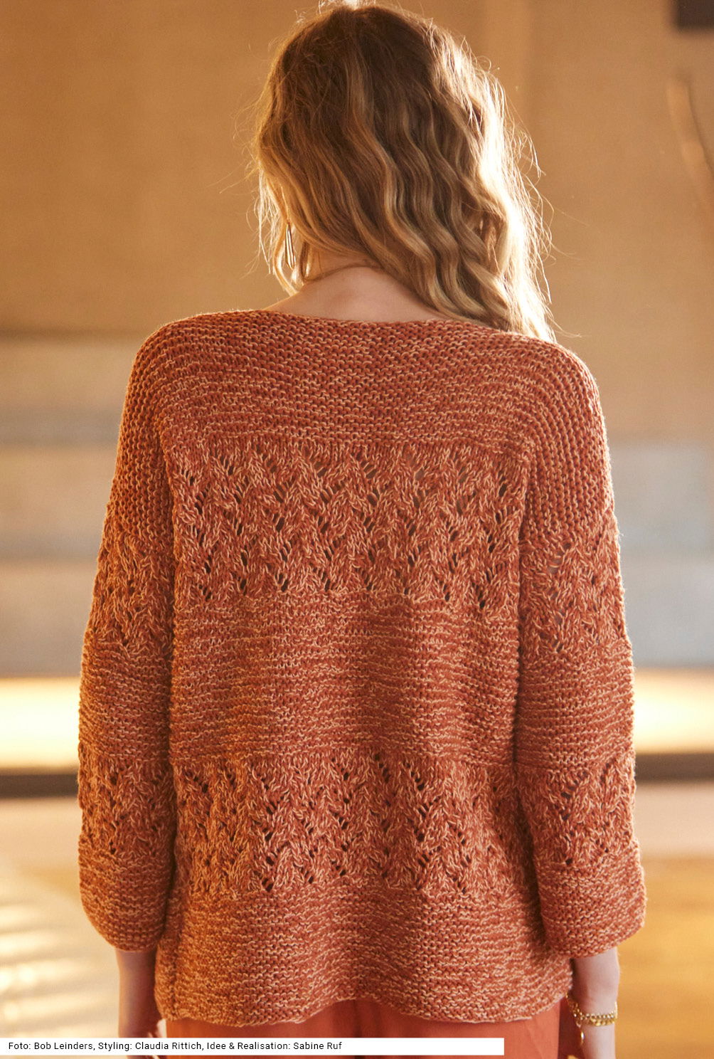 Bei diesem Pulli wird mit zwei Qualitäten, einmal aus Baumwolle und Polyester und einmal aus Polyester, Schurwolle und Seide gearbeitet. Dadurch entsteht der Melange-Effekt der Farbe. Alle Teile sind ganz gerade geschnitten – das macht das Stricken einfach und der Pulli bekommt so einen U-Boot-Ausschnitt und weite Ärmel. Es werden abwechselnd Streifen aus kraus rechten Maschen und Ajourmuster gearbeitet. Die Anleitung für dieses zweifädig mit 6er-Nadeln gestrickte Modell gibt es in den Größen 38/40 und 42/44 sowie 46/48.