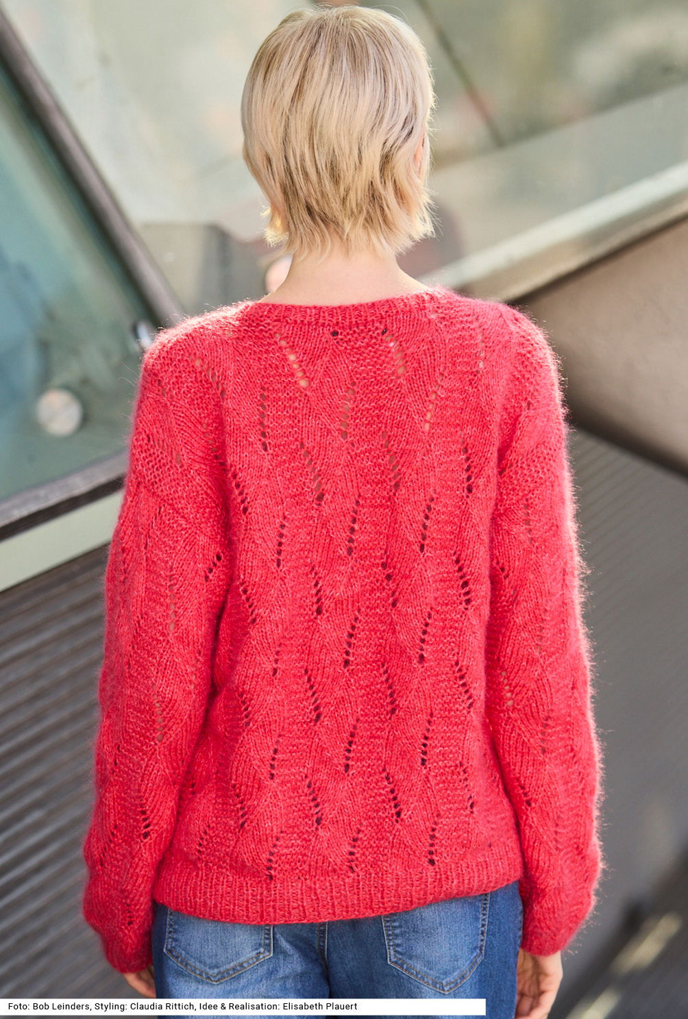 Dieser zweifädig gestrickte Pullover lebt von der Kombination aus zweierlei Garnen in einer Farbe: einmal eines aus Viskose, Baumwolle, Leinen und Polyamid und zum anderen eines aus Mohair und Seide, was einen zarten Flausch erzeugt, bei gleichzeitig edlem Glanz vom glatten Mischgarn. Dazu ein Muster, das wie gefaltete Bänder nach oben schlängelt; es entsteht durch Längsstreifen in kraus rechts und glatt rechts mit zusammengestrickten Maschen und Umschlägen. Bündchen und Halsausschnittblende sind im Rippenmuster gearbeitet. Eine Anleitung gibt es für die Größen 38/40, 42/44 und 46/48.
