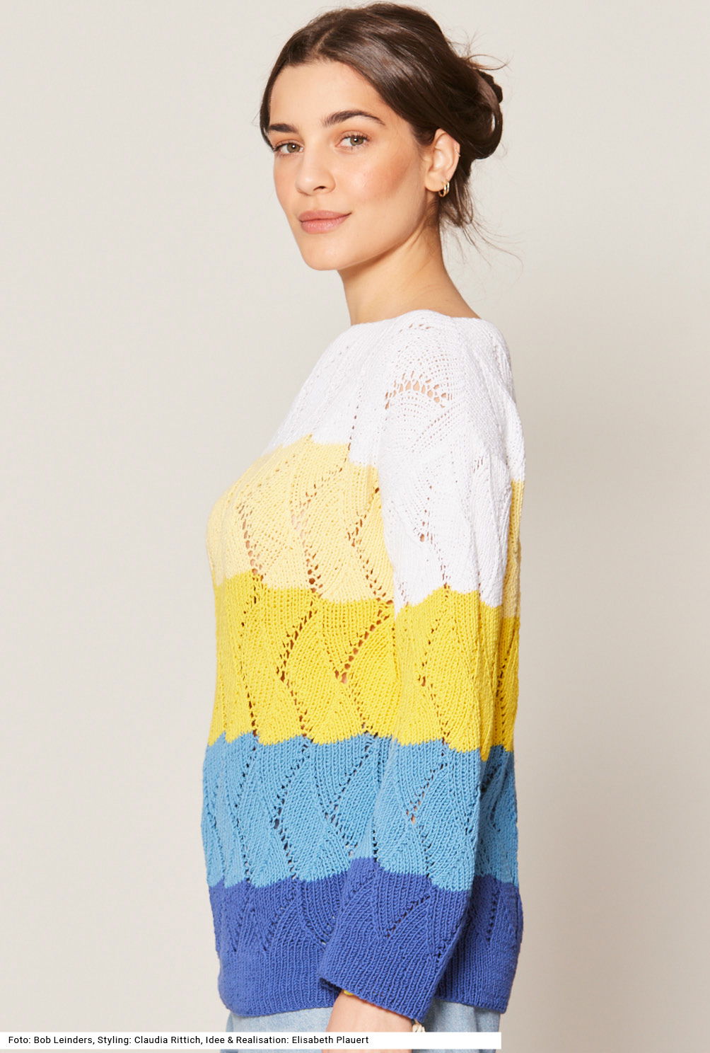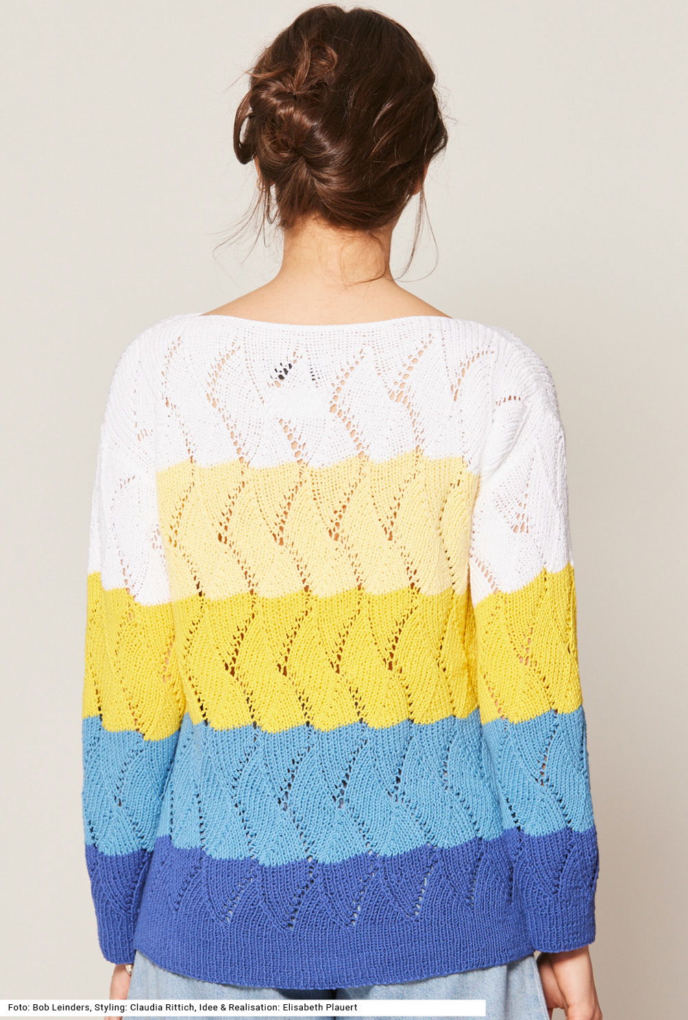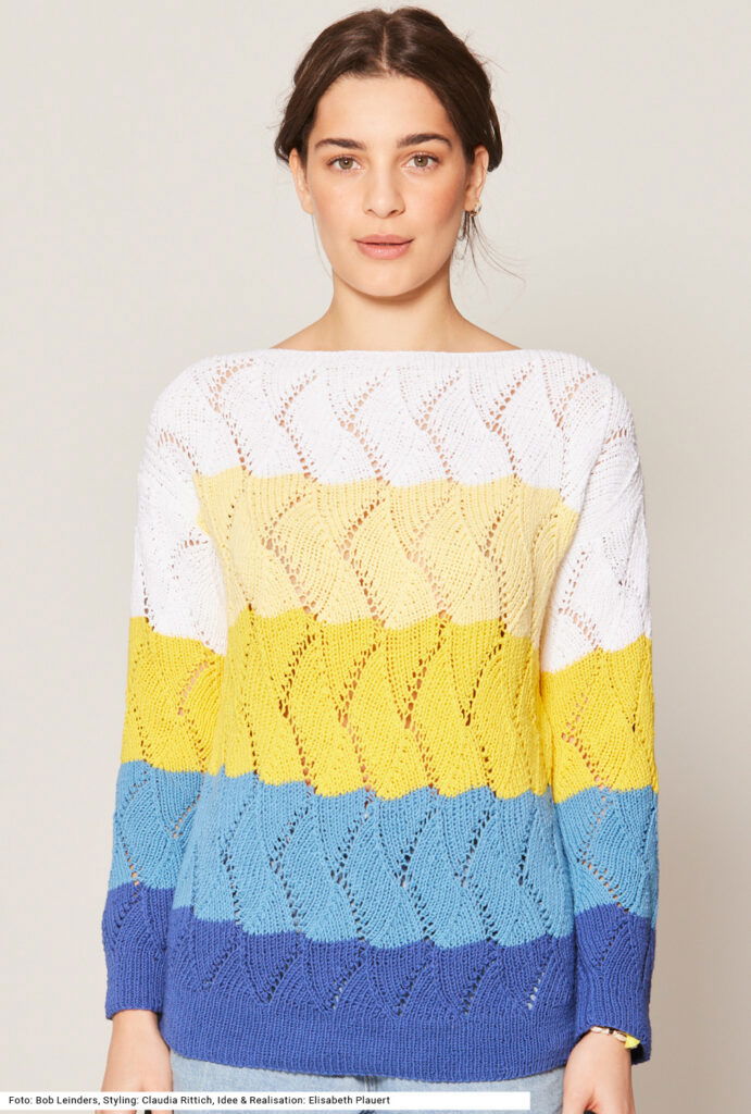 Clean – so ist der erste Eindruck, der sich beim Betrachten dieses legeren Pullis zeigt. Das zackig verlaufende Lochmuster wird durch breite Blockstreifen in einer Farbgebung von dunkel nach hell gestrickt. Alle Teile sind ganz gerade gearbeitet, dadurch erhält der Pulli einen U-Boot-Ausschnitt. Eine Versäuberung des Ausschnitts am Schluss ist nicht nötig, da die oberen 2 cm im Rippenmuster über die ganze Breite gestrickt werden. Auch die Bündchen an Saum und Ärmeln sind im Rippenmuster gearbeitet. Der Pulli ist aus einem sommerlichen Baumwollgarn mit wenig Polyester-Beimischung. Die Anleitung gibt es für die Größen 38/40, 42/44 und 46/48.