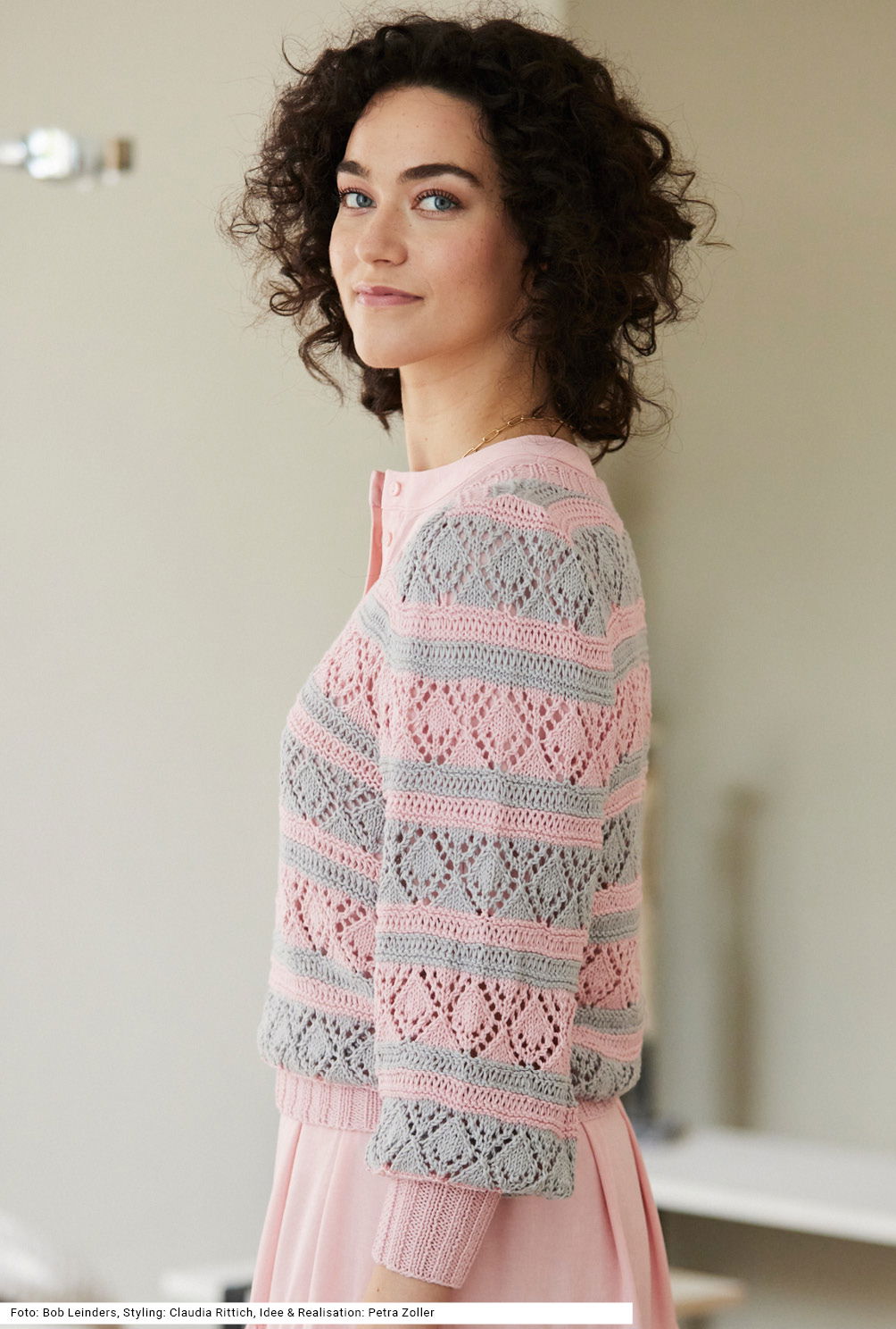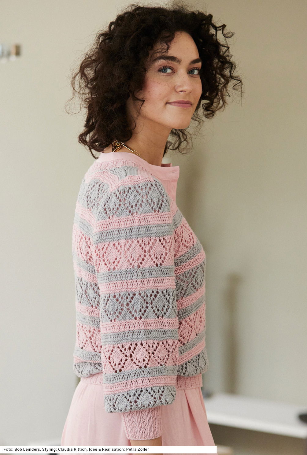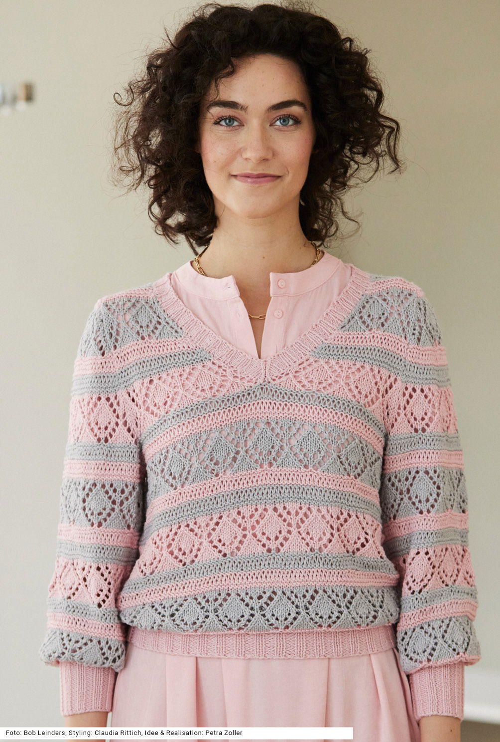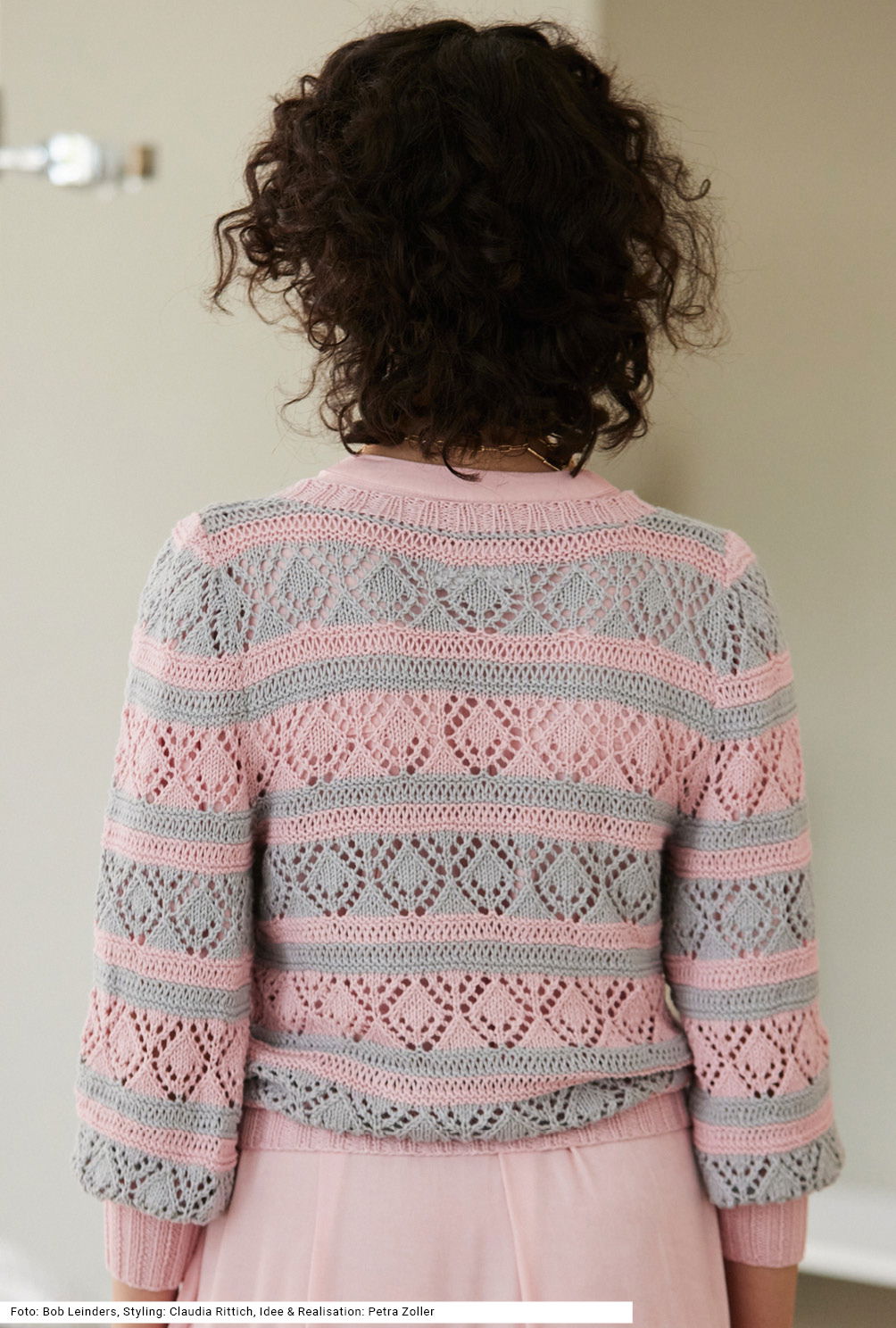 Man sieht es nicht auf den ersten Blick: Das softe Garn trägt sich superangenehm, denn es ist eine Zusammensetzung aus Biobaumwolle und Soja, die diesem Pullover auch noch einen leichten Glanz verleiht. Durch den Wechsel von Fallmaschenrippen – erzeugt durch Umschläge, die in der folgenden Reihe wieder aufgelöst werden – und dem Ajour-Rautenmuster, beide Muster abwechselnd in Rosé und Silber entsteht eine wunderbare Dynamik im Look. Die weiten Ärmel werden von einem schmalen, hohen Rippenbund zusammengehalten. Auch die V-Ausschnittblende und der Bund sind in 2/2-Rippen gearbeitet. Die Anleitung gibt es dazu in den Größen 36/38, 40/42 und 44/46.