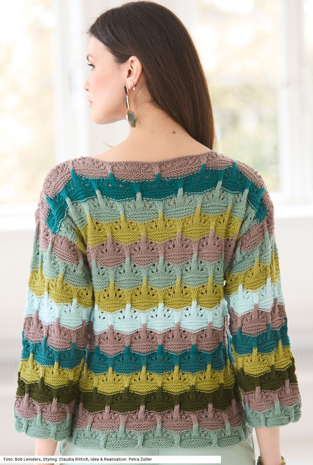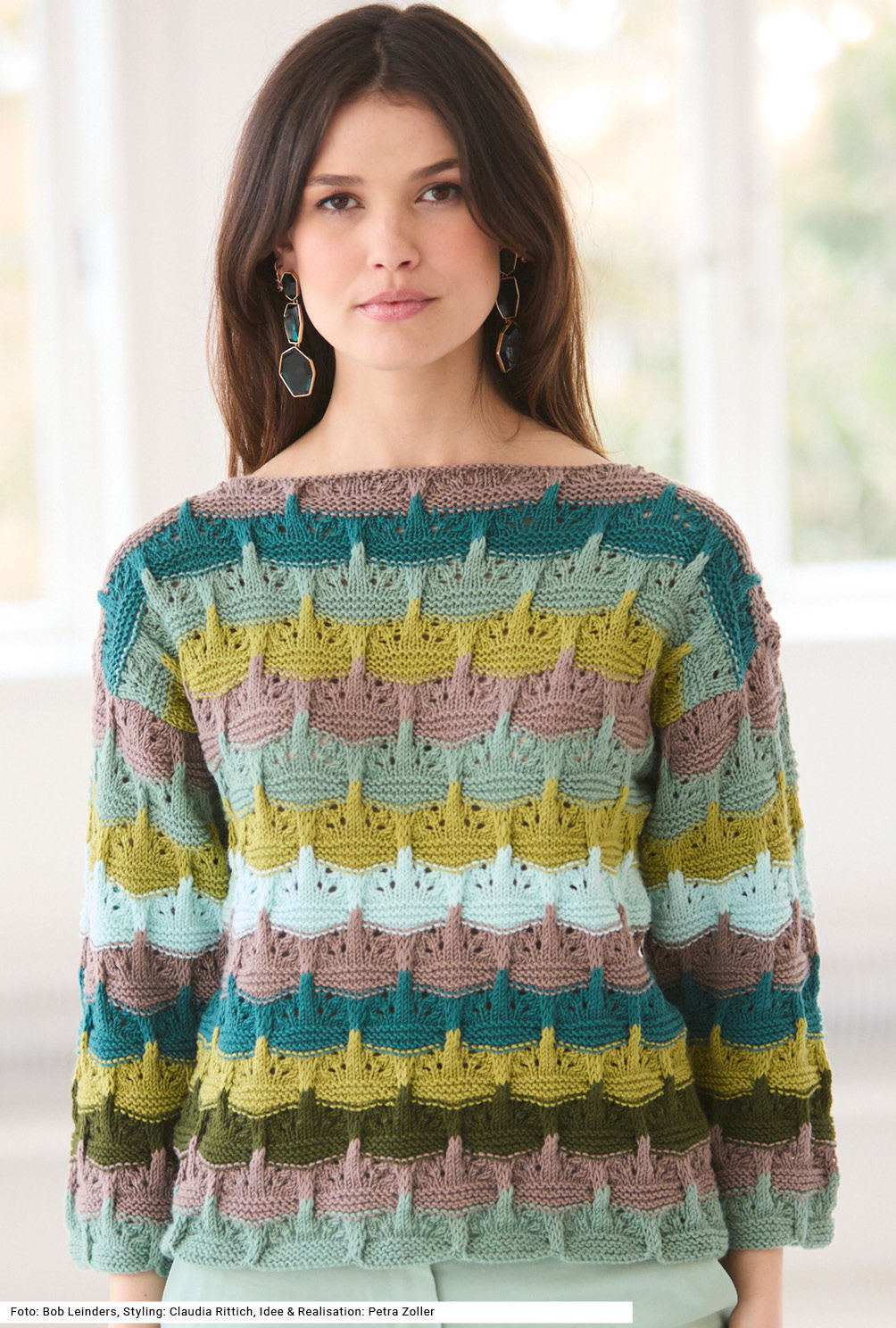Das Hebemaschenmuster mit kraus rechts gestrickten Reihen, glatt rechts und Ajourmuster-Reihen dieses Pullis bewirkt die sanft ineinander laufenden Farben; davon gibt es gleich sechs. Das Muster ist nicht schwer zu stricken. Vorder- und Rückenteil sind ganz gerade, dadurch entsteht ein U-Boot-Ausschnitt, der den Hals schön zur Geltung bringt. Die nach unten offenen Ärmel sind 7/8-lang. Gearbeitet mit einem reinen Schubwollgarn liegt das Modell angenehm weich auf der Haut. Eine Anleitung kann für die Größen 36/38 40/42 und 44/46 downgeloadet werden.