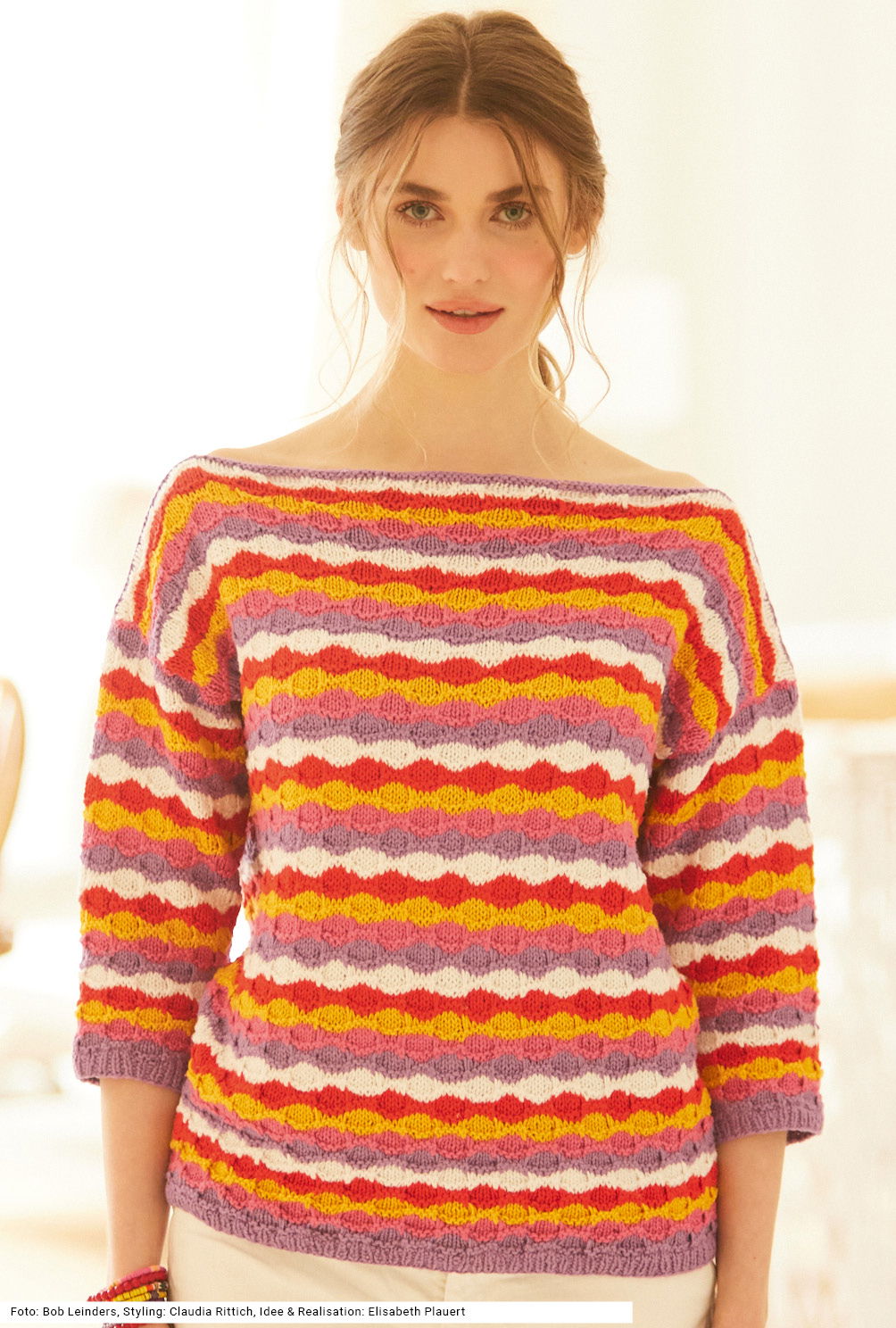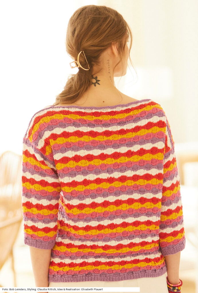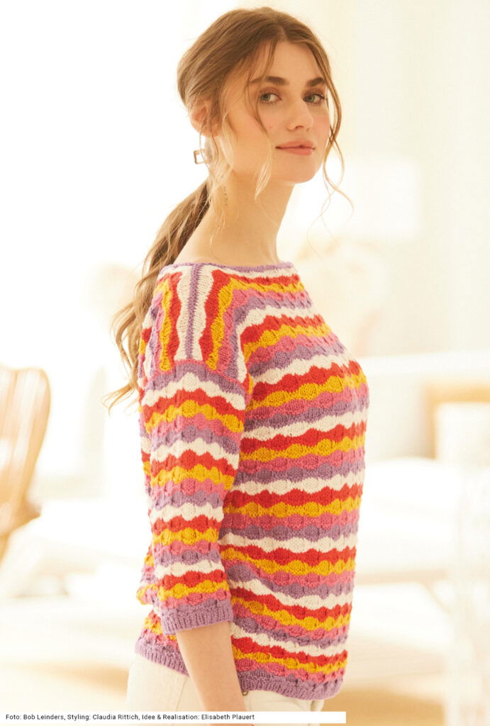 Der Pullover mit U-Boot-Ausschnitt und 3/4-Ärmeln beweist, dass sich auch kraftvolle Farben überaus harmonisch kombinieren lassen – und das, obwohl hier fünf unterschiedliche Nuancen aufeinandertreffen: Orchidee (Lila), Pink, Dottergelb, Feuerrot und Weiß. Das muschelartige Muster entsteht durch Hebemaschen, sodass die Farben quasi ineinandergleiten. Der Schnitt wird nach oben hin breiter, dadurch ergeben sich die überfallenden Schultern. Auch die Ärmel erhalten ihre endgültige Weite erst im oberen Bereich. Wir haben wir ein Mischgarn aus Viskose, Baumwolle, Leinen und Polyamid dafür verstrickt. Eine Anleitung gibt es für die Größen 36/38, 40/42 und 44/46.