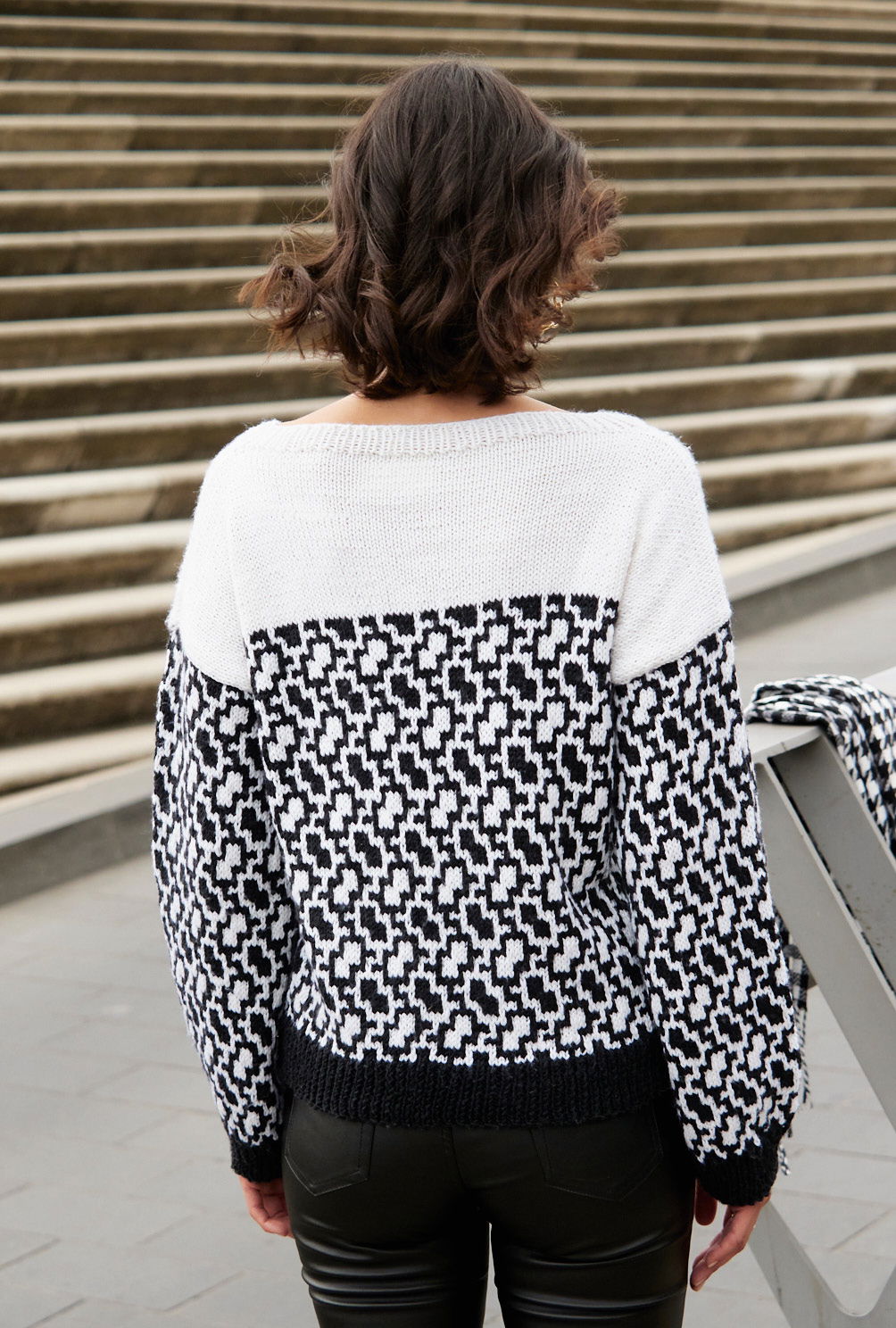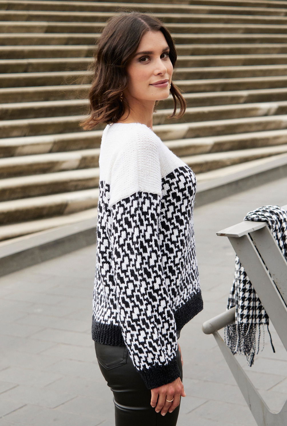 Dieser Pullover mit zweifarbigem Mosaikmuster ist eine klassische Schönheit. Gerade geschnitten, jedoch in der weißen Schulterpartie weiter werdend, lebt er vom Kontrast zwischen markanten Uni-Flächen und dem dynamischen, flirrenden Muster. Das Muster entsteht durch Hebemaschen und bietet reichlich Abwechslung beim Stricken. Für Saum- und Ärmelbündchen werden Rippen ganz in Schwarz gearbeitet. Die Ärmel sind weit und gerade. Dieses Modell ist aus einer sehr edlen Garnmischung aus Schurwolle, Seide und Kaschmir. Die Anleitung hierfür kann in den Größen 38/40, 42/44 und 46/48 downgeloadet werden.