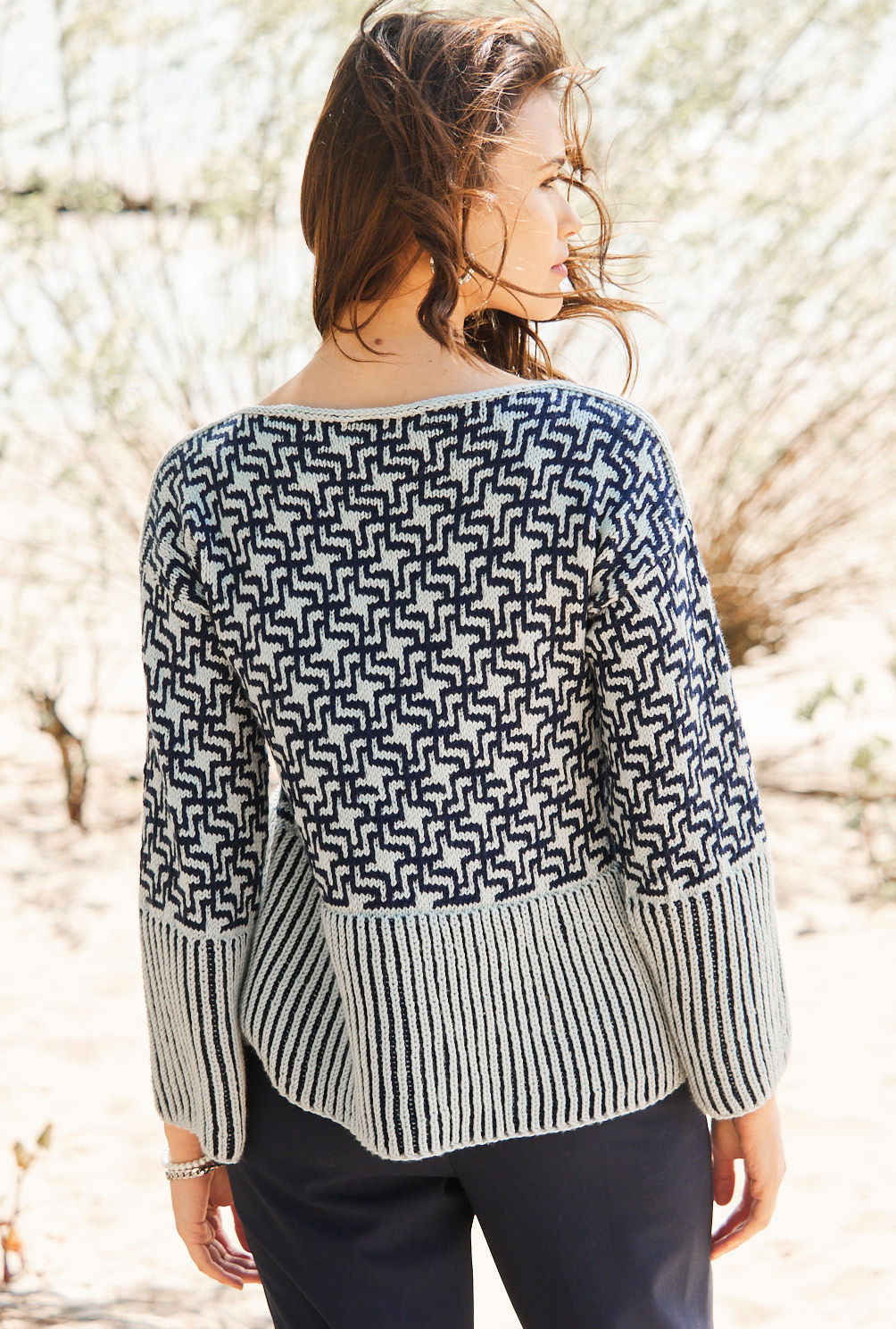 Bei diesem Pullover zieht das zweifarbige Hahnentrittmuster in Hell- und Dunkelblau die Blicke auf sich. Der breite Bund an Vorder-, Rückenteil und Ärmeln im zweifarbigen Vollpatentmuster passt wunderbar als Ergänzung und Kontrast zum folgenden Muster. Obwohl die gleiche Maschenzahl, wirkt dieser Bund wie ein Volant, was den femininen Charakter dieses Modells unterstreicht. Ein hellblauer I-Cord (in der Anleitung genau erklärt) zieht sich entlang des U-Boot-Ausschnitts bis über die ganze Schulter. Die Anleitung kann in den Größen 36/38, 42/44 und 48/50 downgeloadet werden.