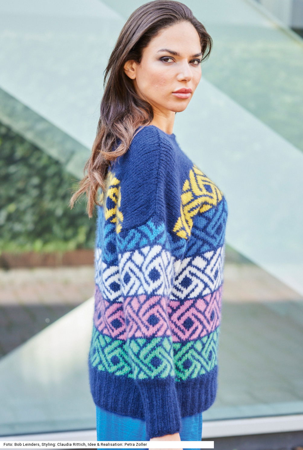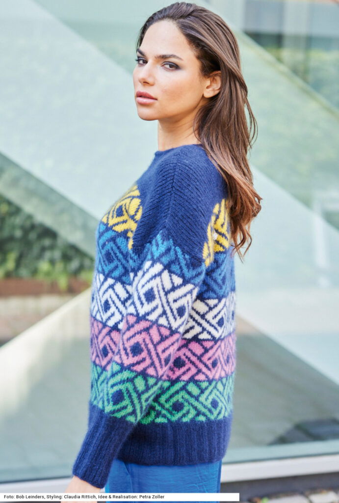 Dieser Pullover ist ausgesprochen kuschelig und warm – was dem luxuriösen Garn aus Kaschmir mit etwas Polyamid-Beimischung zu verdanken ist. Der hohe Wohlfühlfaktor und das farblich spannend arrangierte Jacquardmuster geben dem Pulli für seinen modernen Charakter. Die Bündchen (bei den Ärmeln sehr hoch) sind in Dunkelblau im Rippenmuster gearbeitet, das Jacquardmuster ist glatt rechts gestrickt, dabei bildet Dunkelblau den Grund und Gelb, Pink, Weiß, Royalblau und Grün das mäandernde Muster. Um den Halsausschnitt ist ein I-Cord-Rand gearbeitet. Eine Anleitung gibt es für die Größen 38/40, 44/46 und 50/52.