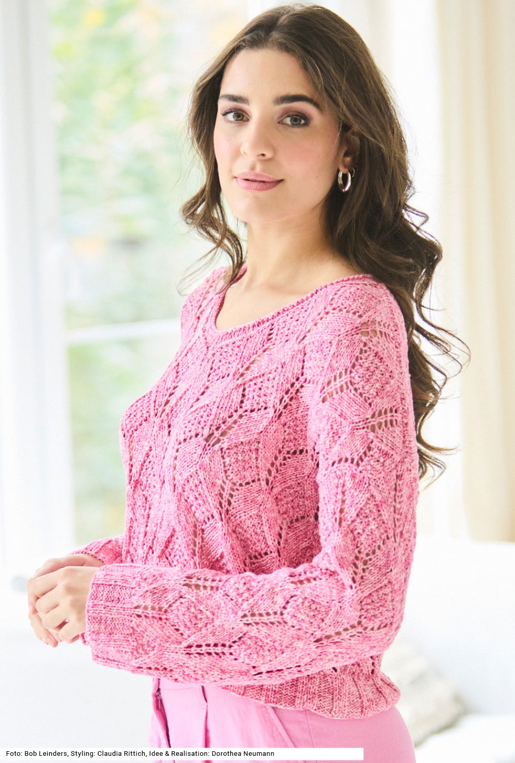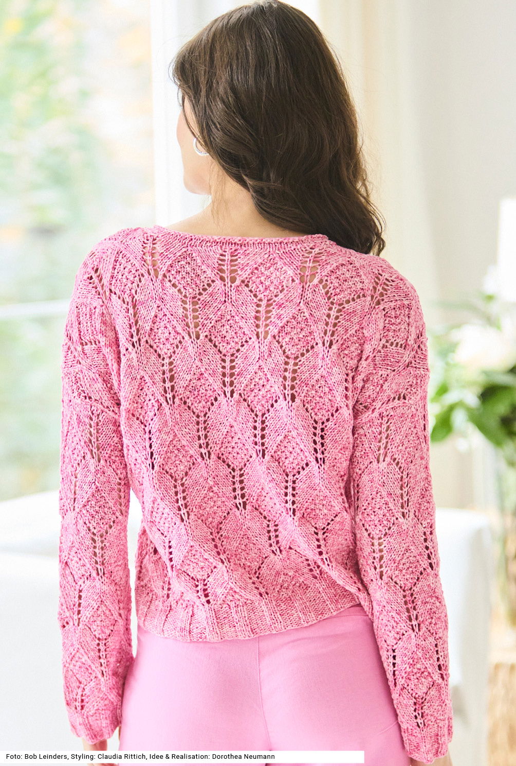 Dieser V-Ausschnitt-Pullover aus einem Baumwollgarn mit Spraydruck vereint Tradition und Moderne – das großzügige Rauten-Ajourmuster ist klassisch gehalten, während der weite, etwas kürzere Schnitt dem Modell eine aktuelle Note verleiht. Die Ärmel beginnen ganz gerade und weit und bekommen dann im oberen Bereich noch etwas mehr Weite. Die Bündchen an Saum und Ärmeln haben ein breites Rippenmuster, wohingegen der V-Ausschnitt eine glatt rechts gestrickte Blende mit einer Abschlussrunde linker Maschen hat. Eine Anleitung gibts für die Größen 38/40 und 44 – 48.
