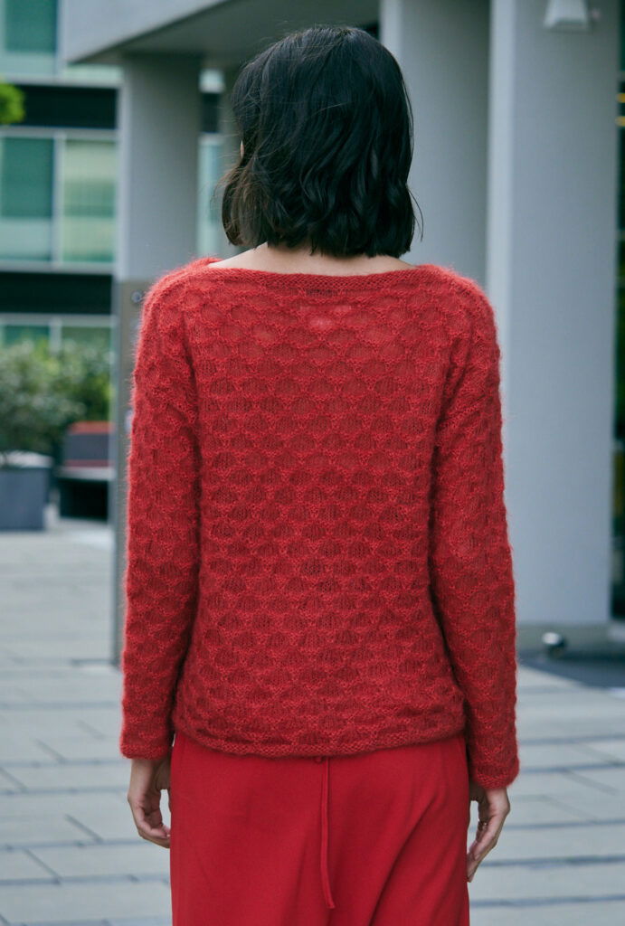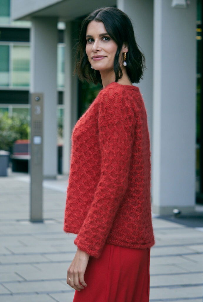 Auffällig ist bei diesem Pulli nicht nur die Farbe in Knallrot, es ist auch das edle Garn aus Mohair mit Seide, das dreifädig verstrickt wird. Der lässige, gerade Schnitt mit überfallenden Schultern und die von unten her geraden, offenen Ärmel, die nach oben hin an Weite gewinnen sowie der kleine runde Halsausschnitt geben diesem besonderen Pulli seine sportliche Lässigkeit. Die schmalen Blenden am Saum, den Ärmeln und dem Halsausschnitt werden glatt links gearbeitet, sodass sie sich leicht einrollen, ansonsten sticht das strukturgebende Wabenmuster ins Auge. Eine Anleitung dazu gibt es für die Größen 36/38, 40/42 und 44/46.