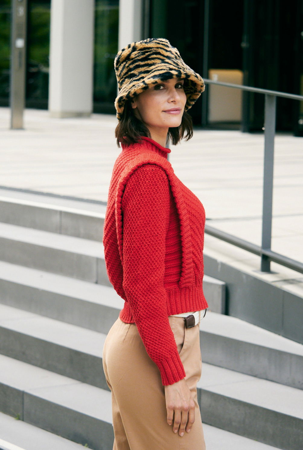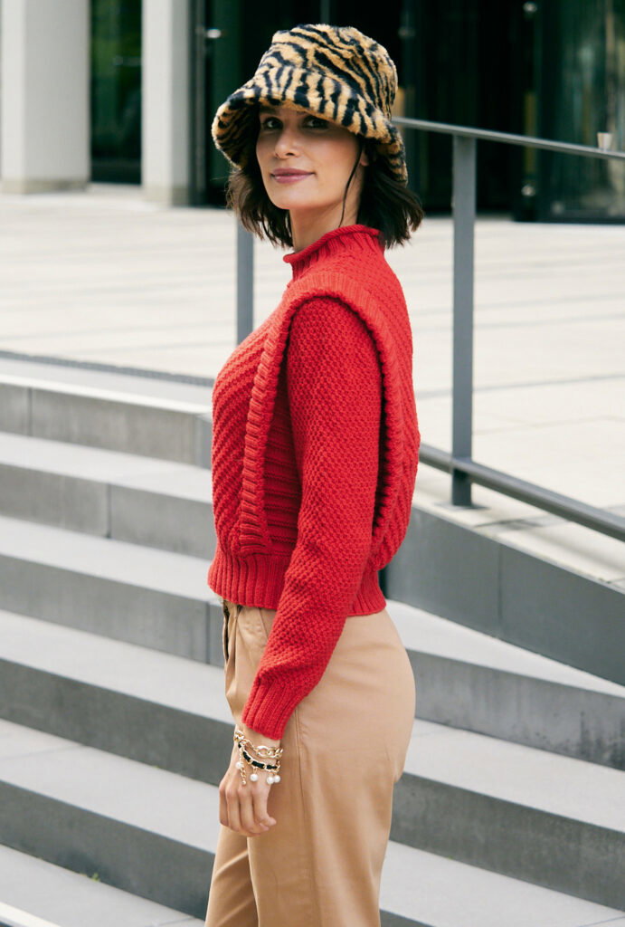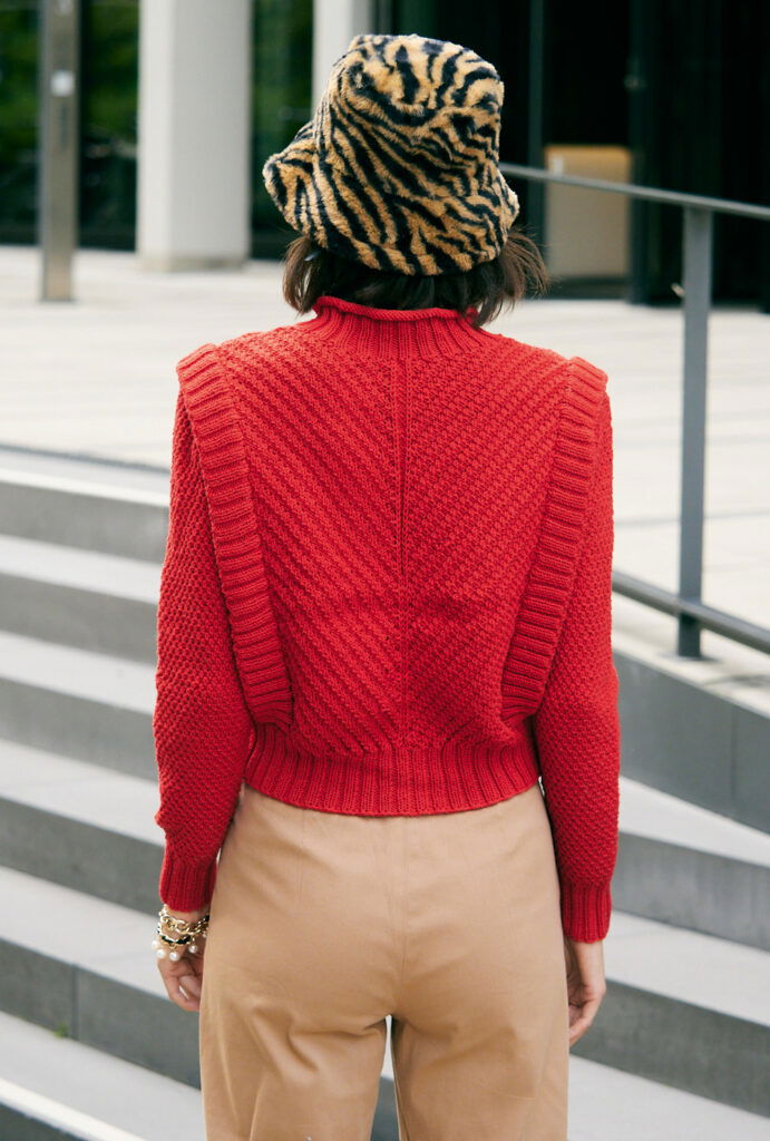 Sabrina Strickjournal Roter Pullover mit aufgesetzten Rippenblenden