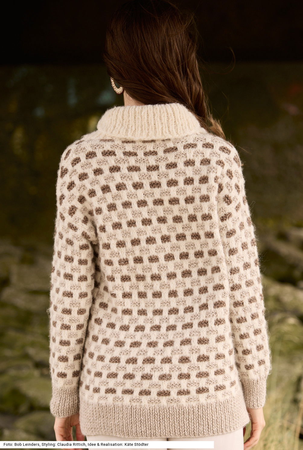 Dieser bequeme Pullover mit wärmendem Schalkragen könnte ein Dauerbrenner in deiner Garderobe werden. Denn dank der sanften Naturtöne (oder auch in kontrastierenden Farben) und seines klassischen Hebemaschenmusters, bei dem unter den abgehobenen Maschen kraus rechte Streifen entlangziehen, lässt sich das Modell zu vielen verschiedenen Outfits kombinieren. Bündchen und Schalkragen werden im 1/1-Rippenmuster in unterschiedlichen Farben gestrickt. Die Garne sind einmal eines aus Alpaka, Schurwolle und Baumwolle und einmal ein sehr weiches aus Schurwolle und Alpaka. Die Anleitung gibts für die Größen 38/40, 42/44 und 46/48.