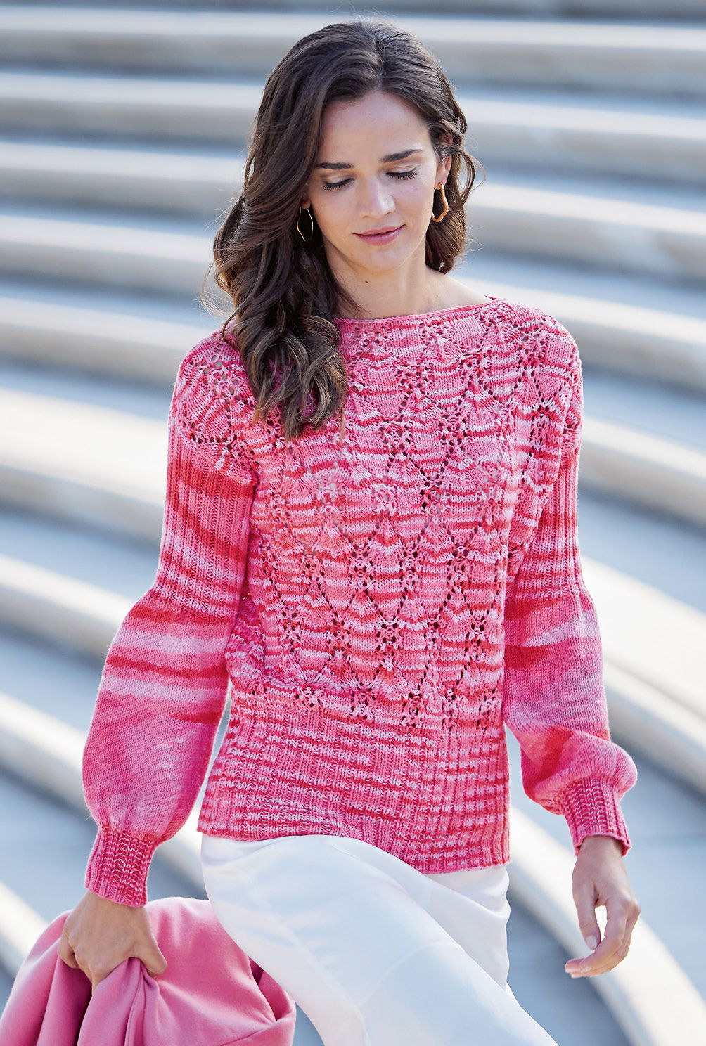 Von zartem Rosa bis hin zu leuchtendem Pink – der Farbverlauf des Baumwoll-Leinengarns ist beeindruckend und lässt genügend Raum für den Mustermix aus Ajour- und Rippenstrukturen. Besonderes Highlight sind die femininen Ärmel. Gestrickt wird der Sommerpulli in einzelnen Teilen von unten nach oben, erst im Rippenmuster, danach im Lochmuster. Das Ajourmuster braucht schon etwas Konzentration, ist jedoch nicht allzu schwierig und die übersichtliche Strickschrift hilft zusätzlich dabei, stets den Überblick zu behalten. Bei den Ärmeln wechseln sich Rippen und glatt rechts gestrickte Abschnitte ab – zusammen mit Zu- und Abnahmen entsteht so die ganz besonders schöne Ärmelform. Sind alle vier Teile fertig gestrickt, werden noch alle Nähte geschlossen und aus dem Halsausschnitt die Blende herausgearbeitet.