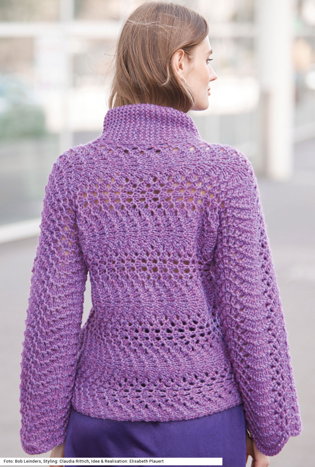 Dieser Pulli aus einem weichen, voluminösen Garn ist überaus farbstark. Er wird quer gestrickt und kombiniert kraus rechte Maschen mit einem eleganten Pfauenmuster. Das Pfauenmuster wird nach Strickschrift gearbeitet, wobei in den Rückreihen die Maschen gestrickt werden, wie sie erscheinen und die Umschläge links gestrickt werden. Vorder- und Rückenteil werden jeweils mit halben Ärmeln in einem Stück gestrickt, beginnend mit dem rechten bzw. linken Ärmel und an den Seitenlinien durch Zunahmen erweitert. Ein Stehkragen in kraus rechts und verkürzte Reihen sorgen für eine bequeme Passform, während Knötchen-Randmaschen und Doppel-Maschen die Kanten sauber abschließen.