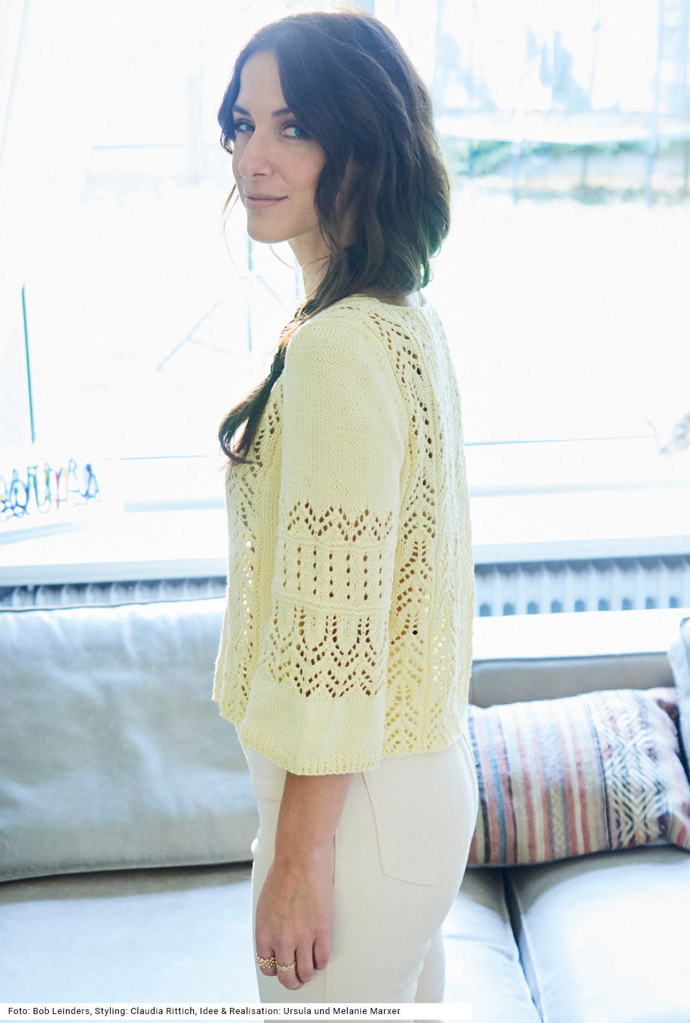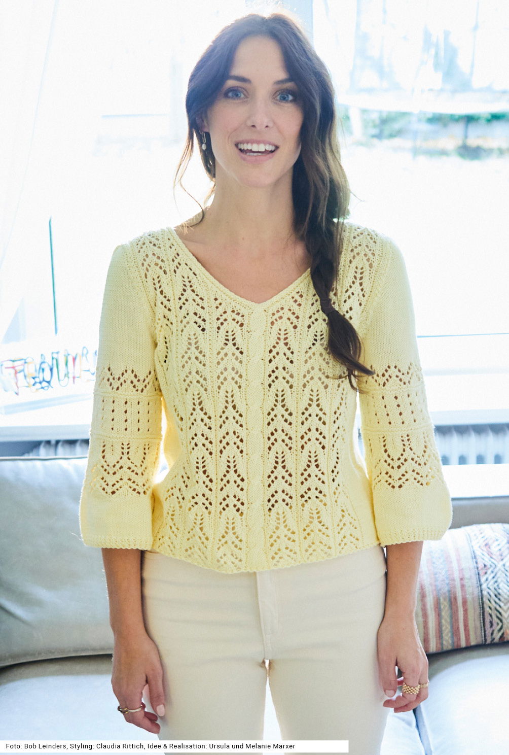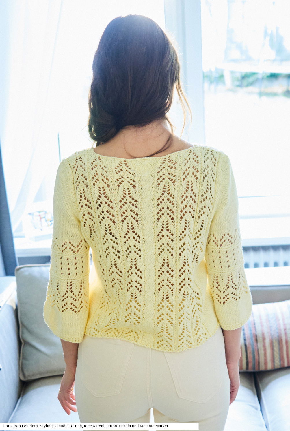 Dieser leichte Baumwoll-Pulli vereint lässig-elegant verschiedene Musterarten. In der Mitte verläuft ein schmaler Zopf, der sich für den V-Ausschnitt teilt und dann hälftig an den Ausschnittschrägen entlangläuft. Ajourmuster im Vorderteil sowie an den Ärmeln unterstreichen den luftigen Charakter des Pullovers. Die Seitenpartien und nach den Ärmelbündchen sowie im oberen Ärmelbereich wird glatt rechts gearbeitet. Die Tulpenärmel entstehen durch die große Maschenzahl zu Beginn, die dann stark reduziert wird. Armkugeln sorgen für einen exakten Sitz an den Schultern. Eine Anleitung gibt es für die Größen 36/38, 40/42 und 44/46.