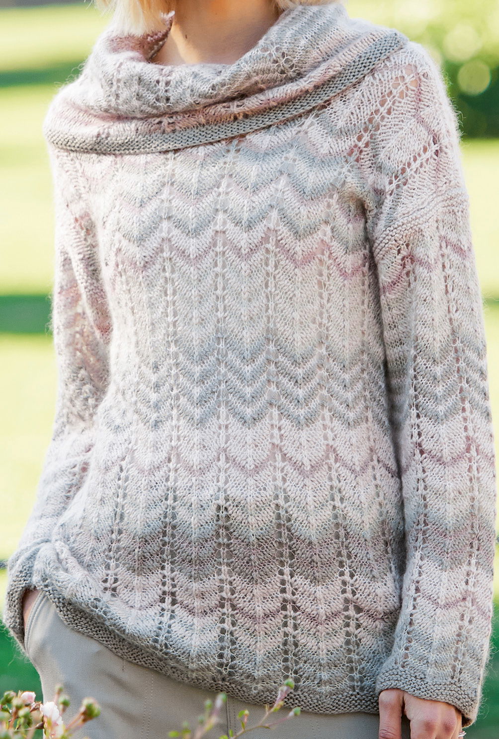 Für den sanften Einstieg in den Frühling sind zarte Nuancen wie Rosé, Rosenholz und Lindgrün geradezu ideal. Und sie verstehen sich prächtig auch miteinander – wie der „zackige“ Materialmix-Pulli auf eindrucksvolle Weise zeigt. Gestrickt wird in einzelnen Teilen von unten nach oben. Die Muster- und Streifenfolge ist nicht kompliziert und Reihe für Reihe in der Anleitung ausführlich beschrieben. Für das Zackenmuster hilft eine klare Strickschrift dabei, die Übersicht zu behalten. Besonders praktisch: Der markante weite und anschmiegsame Kragen wird direkt bei Vorder- und Rückenteil mit angestrickt. So müssen ganz zum Schluss nur noch die Nähte geschlossen werden.