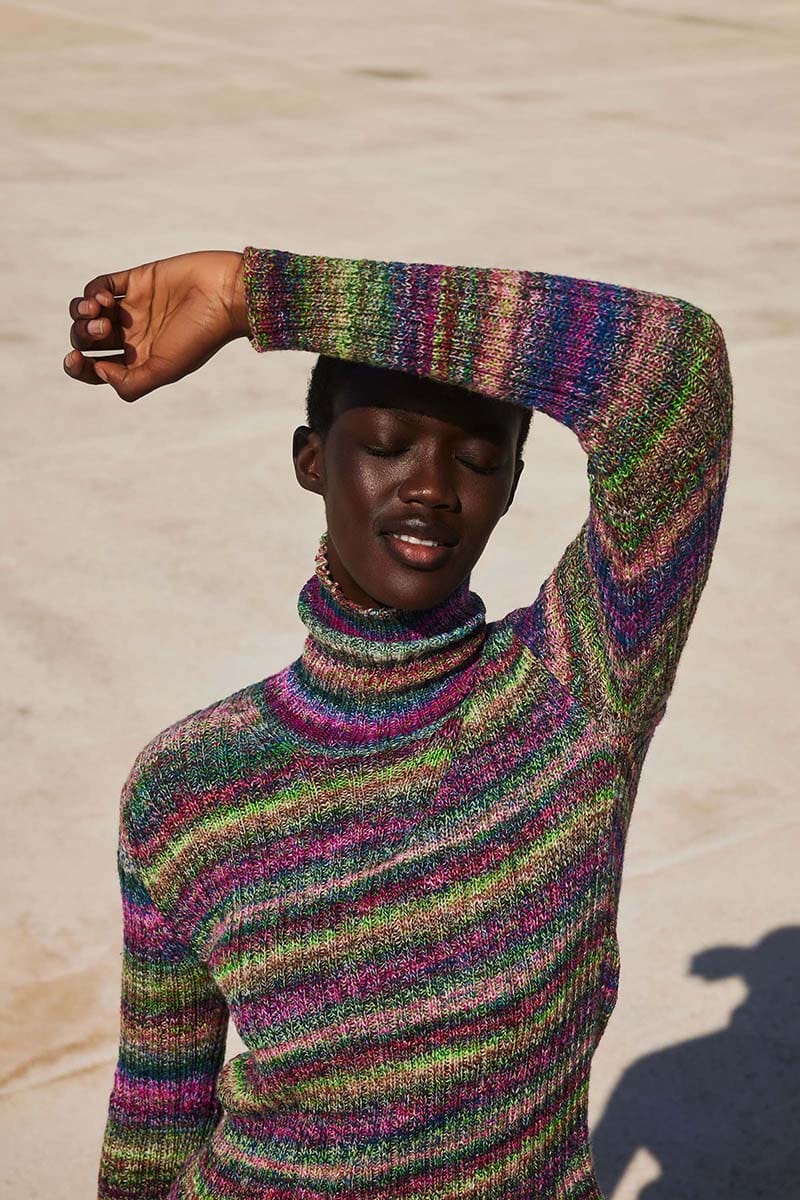 With its turtleneck and ribbed texture, the RAINBOW SOUL sweater is as cozy as it is vibrant. The yarns stunning striped effect makes the colors flow seamlessly into each other, adding both depth and movement to the design. A true celebration of color, this sweater radiates energy and joy.