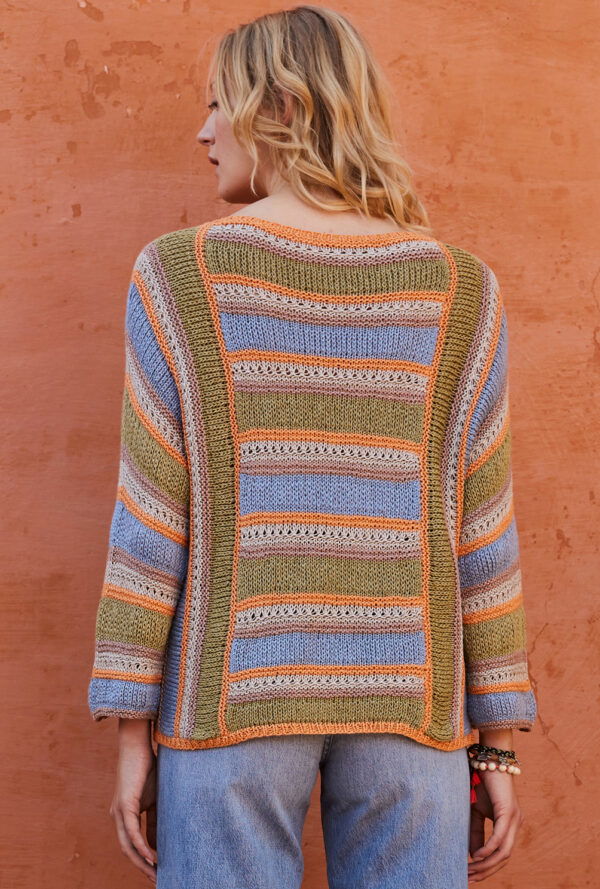 Streifenpulli mit Ajourmuster in Grün, Orange und Camel