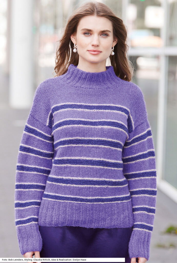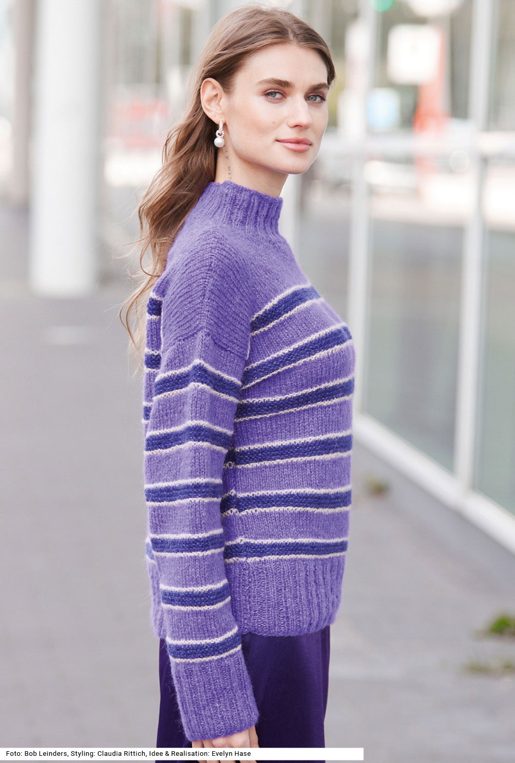 Dieser Streifenpulli ist ein absoluter Klassiker und Allrounder – dazu noch ein Modell, das auch für Strickanfänger geeignet ist! Die Bündchen sind im Rippenmuster gearbeitet, im Hauptteil wechseln sich kraus rechts und glatt rechts gestrickte Streifen ab. Dennoch ist das Modell ein echter Hingucker, denn das Garn sorgt für eine edle, sanft fließende Silhouette und die Farben sind perfekt aufeinander abgestimmt, bieten genau das richtige Maß an Kontrast und Harmonie.