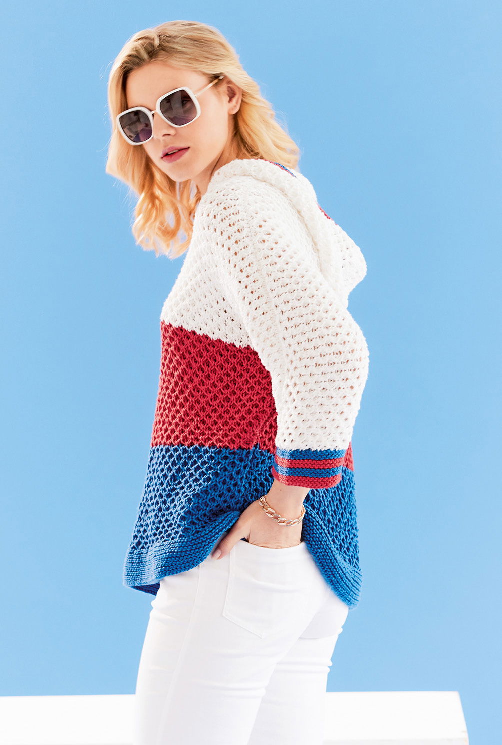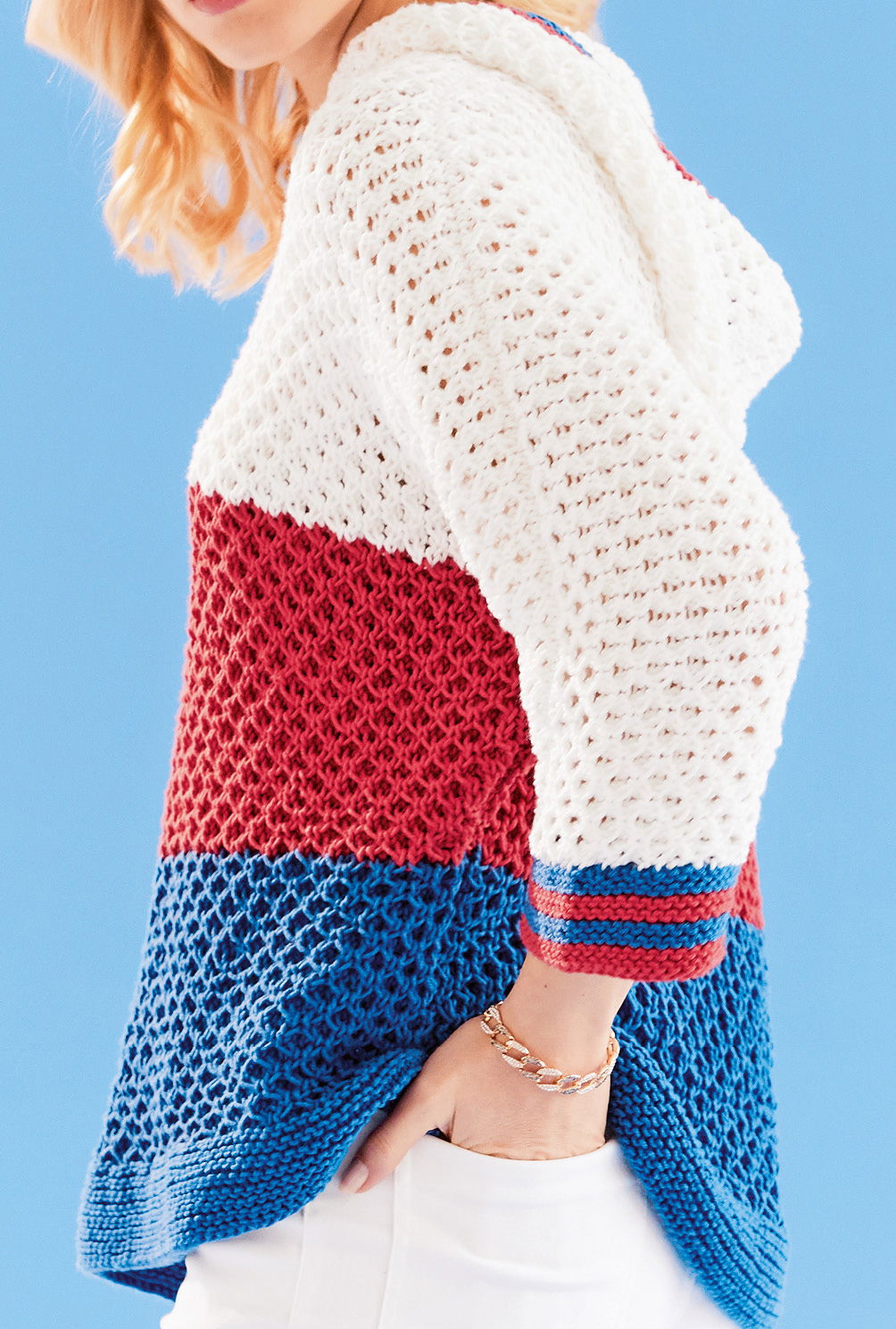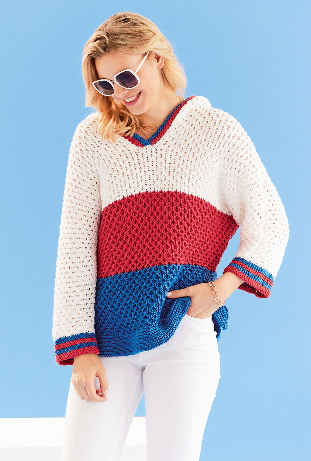 Sportlicher Pullover im Marine-Look! Dieser sportliche Hoody geht mit Blockstreifen auf große Fahrt. Das dreidimensionale Rautenmuster, das mit zwei unterschiedlichen Nadelstärken gestrickt wird, bringt zustätzlich Bewegung in die Masche. Die angestrickte Kapuze sorgt an diesem Pulli dafür, dass Kopf und Nacken auch bei einer kühlen Brise schön warm bleiben. Schmale kraus rechte Blendenstreifen halten die Ärmel- und Kapuzenränder des Oversize-Pullovers in Form und bringen das Weiß von Passe, Kapuze und Fledermaus-Ärmel noch mehr zum Strahlen. Mit dieser Strickanleitung mit mittlerem Schwierigkeitsgrad können Strickerinnen den Pulli in den Größen 38/40, 42/44, 46/48 stricken.