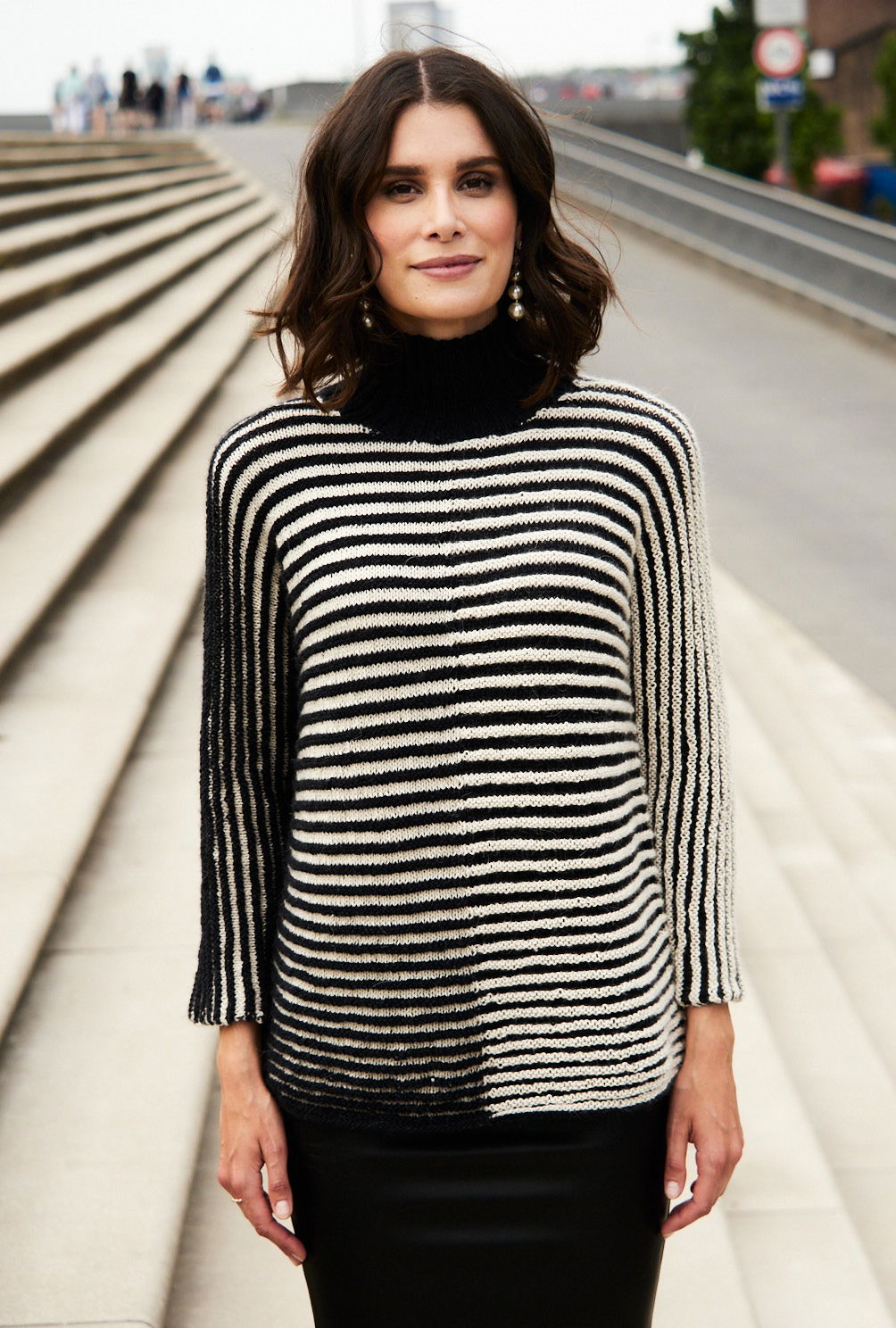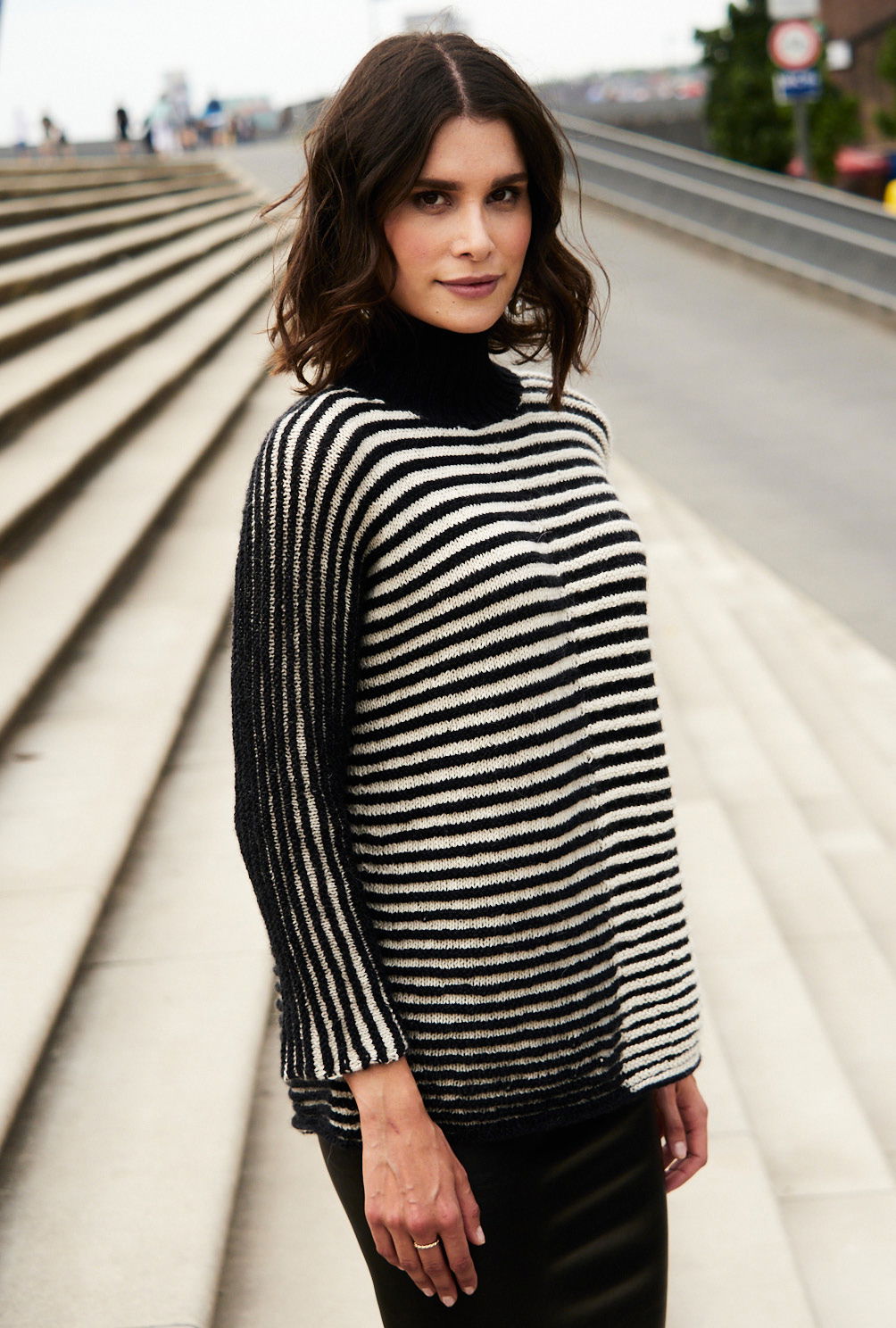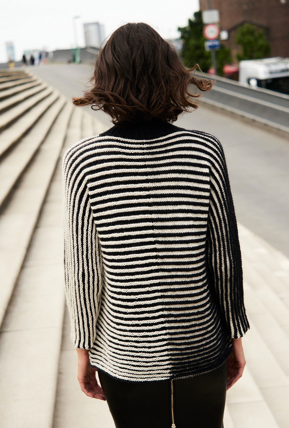 Der Pulli mit Rippenmuster-Streifen wird in einem Stück über die Schultern hinweg gestrickt und wirkt durch den mehrfachen Kontrast zwischen Schwarz & Weiß sehr modern. Diese Art des Musters nennt sich Schattenstricken; in der vorderen und hinteren Mitte treffen sich die Streifen, bleiben zwar in der Farbe gleich, glatt rechts und glatt links wechselt jedoch, wodurch dieser Hoch-tief-Effekt entsteht. Der Rollkragen im Rippenmuster ist ganz ruhig in Schwarz gehalten. Das hochwertige Garn aus Mohair, Lama und Seide hat einen sehr angenehmen weichen Griff. Eine Anleitung gibt es für die Größen 38/40, 42/44 und 46/48.