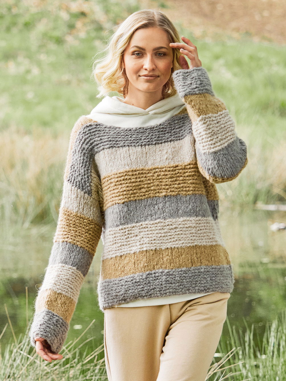 Mit seiner geraden Form ist dieser Pullover die ideale Wahl – auch Strickneulinge kommen mit diesem einfachem Blockstreifenmuster sicher ans Ziel. Das flauschige Garn, ermöglicht ein einfaches Strickerlebnis mit seinen Maschen glatt rechts oder kraus rechts gestrickt. Dieser Pulli bietet nicht nur einen perfekten Look, sondern ist auch äußerst lässig zu tragen und passt zu vielerlei Outfits. Die Kombination aus Einfachheit und Eleganz macht ihn zu einem vielseitigen Kleidungsstück, das in keiner Garderobe fehlen sollte.