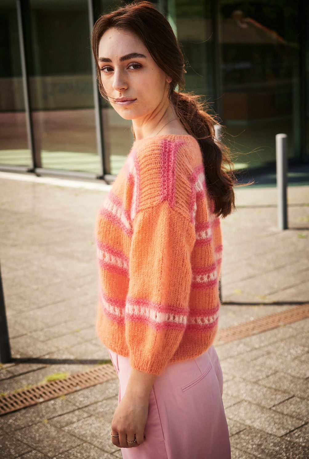 Der kurze, weite Pulli im Cropped Style wird aus einem herrlich luftigen, flauschigem Mohair-Seidengarn gestrickt. Dank des einfach zu arbeitenden Streifenmusters sowie der geraden Ärmelform eignet er sich auch für Strick-AnfängerInnen. Die mal breiten, mal schmalen Streifen bestehen aus glatt rechts und kraus rechts gestrickten Reihen in Nektarine und Neon-Koralle, unterbrochen von apricotfarbenem Lochmuster. Eine kastige Form und die extraweiten, gerade gearbeiteten dreiviertellangen Ärmel, die nur einmal die Streifenkombi zeigen, zeichnen dieses Modell aus. Eine Anleitung steht in den Größen 36/38, 40/42 und 44/46 zur Verfügung.