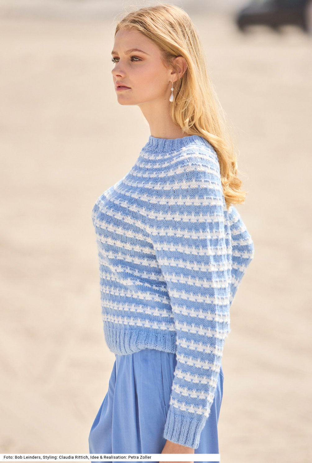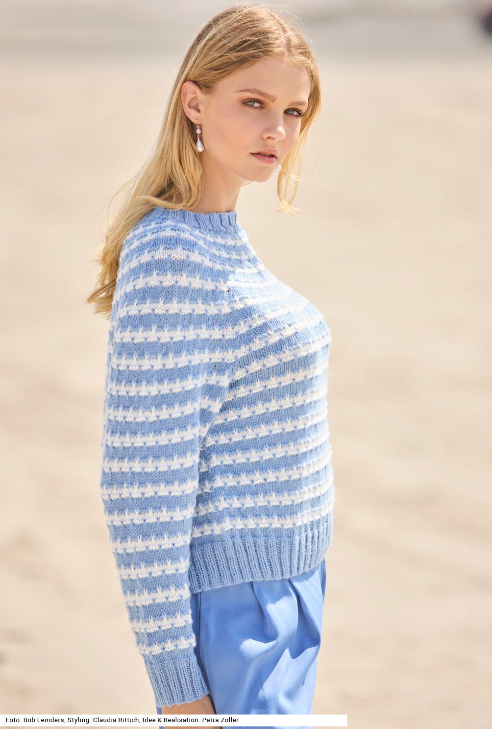 Der bequeme Pulli aus einem angenehm weichen Mischgarn, bestehend aus Polyacryl und Polyamid, besticht durch sein Hebemaschenmuster, bei dem zwei Farben zu gleichmäßigen Streifen verschmelzen. Vorder- und Rückenteil werden bis zu den Armausschnitten rund gestrickt, die Ärmel, ebenfalls bis zu dieser Stelle, danach kommen alle Maschen auf eine Rundstricknadel und die Passe wird in einem Stück wieder rund gearbeitet. Die Bündchen und der Stehkragen sind im 2/2-Rippenmuster gestrickt. Eine Anleitung gibt es für die Größen 36/38 und 40/42 sowie 44/46.