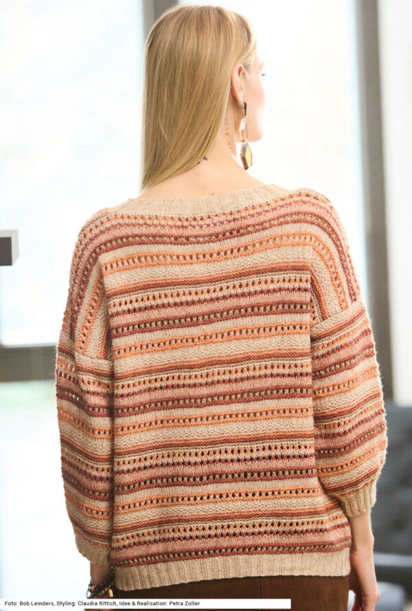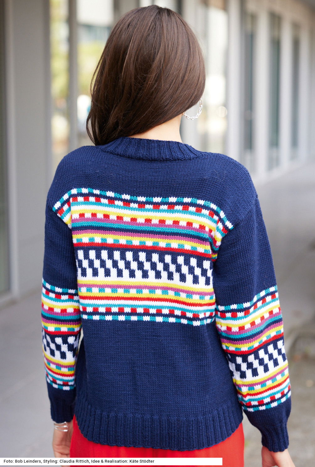 Sabrina Strickjournal Pulli mit Jacquardstreifen in Marine, Weiß, Petrol, Pink, Rot und Gelb