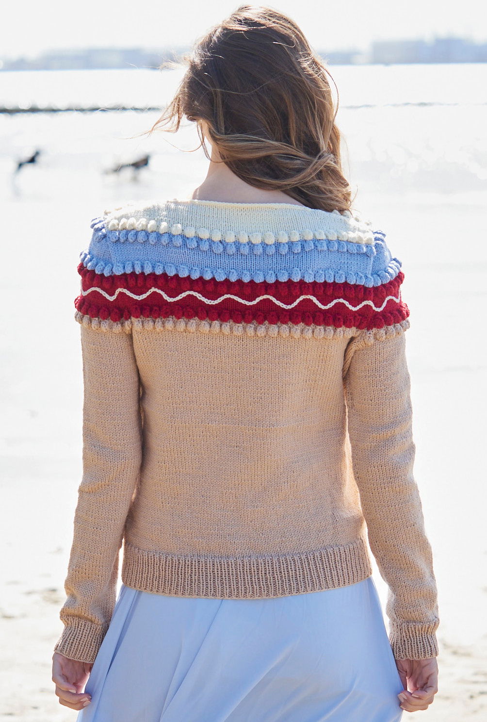 Der Pulli aus weichem reinen Schurwollgarn setzt den Fokus ganz auf die Schulterpartie. Sie wird durch farbige Streifen mit dichten Noppenlinien und einer aufgestickten geschwungenen ecrufarbenen Linie aus Kettenstichen betont. Die Noppen begrenzen jeweils die roten, hellblauen und ecrufarbenen Streifen. An den runden Halsausschnitt kommt zum Schluss noch eine Runde fester Maschen in Ecru. Die überwiegende Fläche wird glatt rechts in Beige gestrickt, ansonsten sind die Bündchen in 1/1-Rippen gearbeitet. Eine Anleitung steht für die Größen 36/38, 40/42 und 44/46 zur Verfügung.
