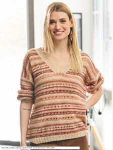 Schmale Streifen aus Ajourmuster, glatt rechts, kraus rechts, Lochmuster und kleinem Perlmuster und dazu harmonisch aufeinander abstimmte Farben kennzeichnen diesen Pulli mit V-Ausschnitt. Das Garn besteht aus einem weichen Gemisch aus Baumwolle, Schurwolle und Yak. Dies macht den Pullover angenehm leicht und zudem anschmiegsam. Der Bund und auch die Bündchen an den Ärmeln werden 2 rechts, 2 links im Rippenmuster gearbeitet; auch die V-Ausschnittblende besteht aus diesen Rippen. Eine Anleitung steht für die Größen 36/38, 40/42 und 44/46 zur Verfügung.