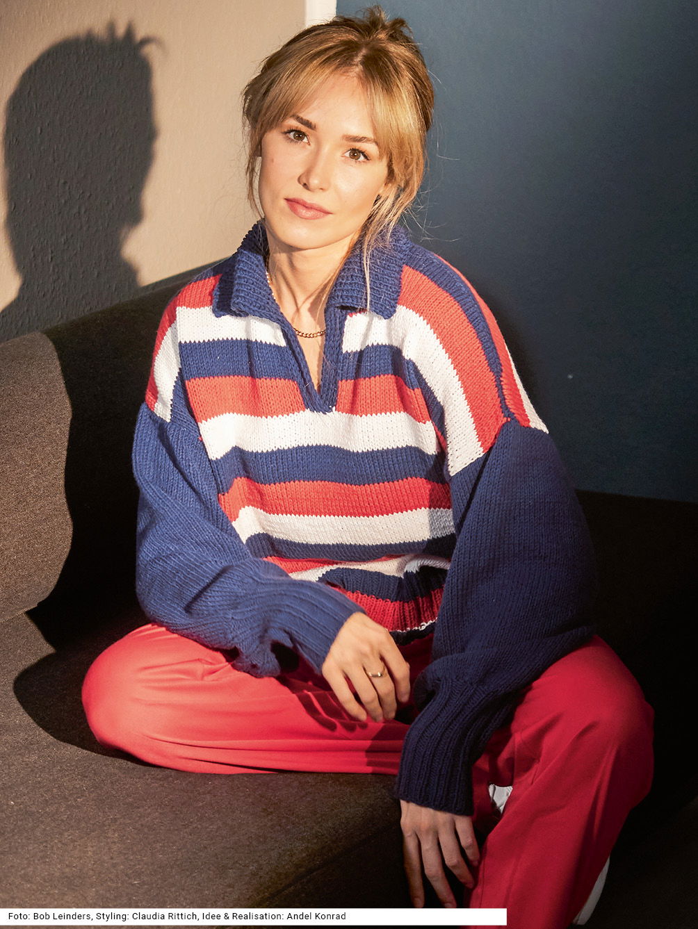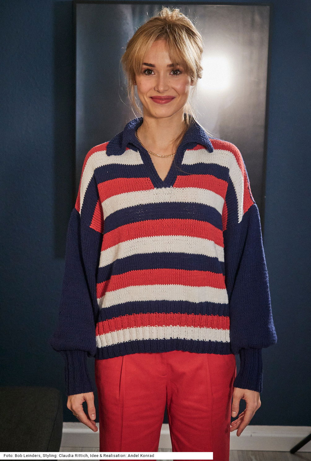 Dieser sportliche Pullover ist in Vorder- und Rückenteil dynamisch blau-weiß-rot gestreift, während die Ärmel mit auffällig hohen Rippenbündchen ganz in Nachtblau gestrickt werden. Der Umschlagkragen am Poloausschnitt ist ebenfalls in kraftvollem Nachtblau gehalten und wird im Doppelstrick (1 Masche rechts stricken, 1 Masche links abheben im Wechsel) gearbeitet, sodass er etwas stabiler ist. Bei den Ärmeln wird nach den Bündchen stark zugenommen, dadurch bekommen sie eine bequeme Weite. Das Garn aus einer Baumwolle-Polyester-Mischung kann in der Maschine gewaschen werden. Eine Anleitung gibt es für die Größen 40/42, 44/46 und 48/50.