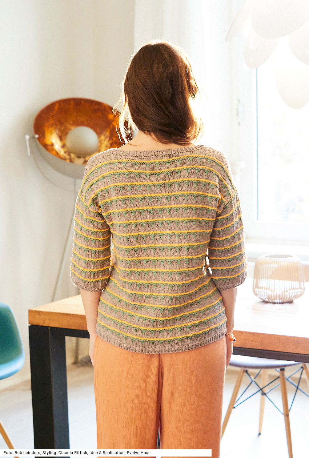 Der Pullover aus reiner Baumwolle wird von erdigen Farbtönen dominiert, doch die schmalen Streifen in strahlendem Orange sorgen für ein frisches Flair. Für das Jacquardmuster mit Hebemaschen wird abwechseln in Braun und Grün gestrickt – das gelingt auch AnfängerInnen. Durch den geraden Schnitt mit tiefem, rundem Halsausschnitt und bis knapp über die Ellbogen reichenden Ärmeln sitzt der Pulli leger. Alle Bündchen und die Ausschnittblende werden 1 rechts verschränkt, 1 links im Wechsel gearbeitet. Die Anleitung hierfür gibt es in den Größen 36/38, 40/42 und 44/46.