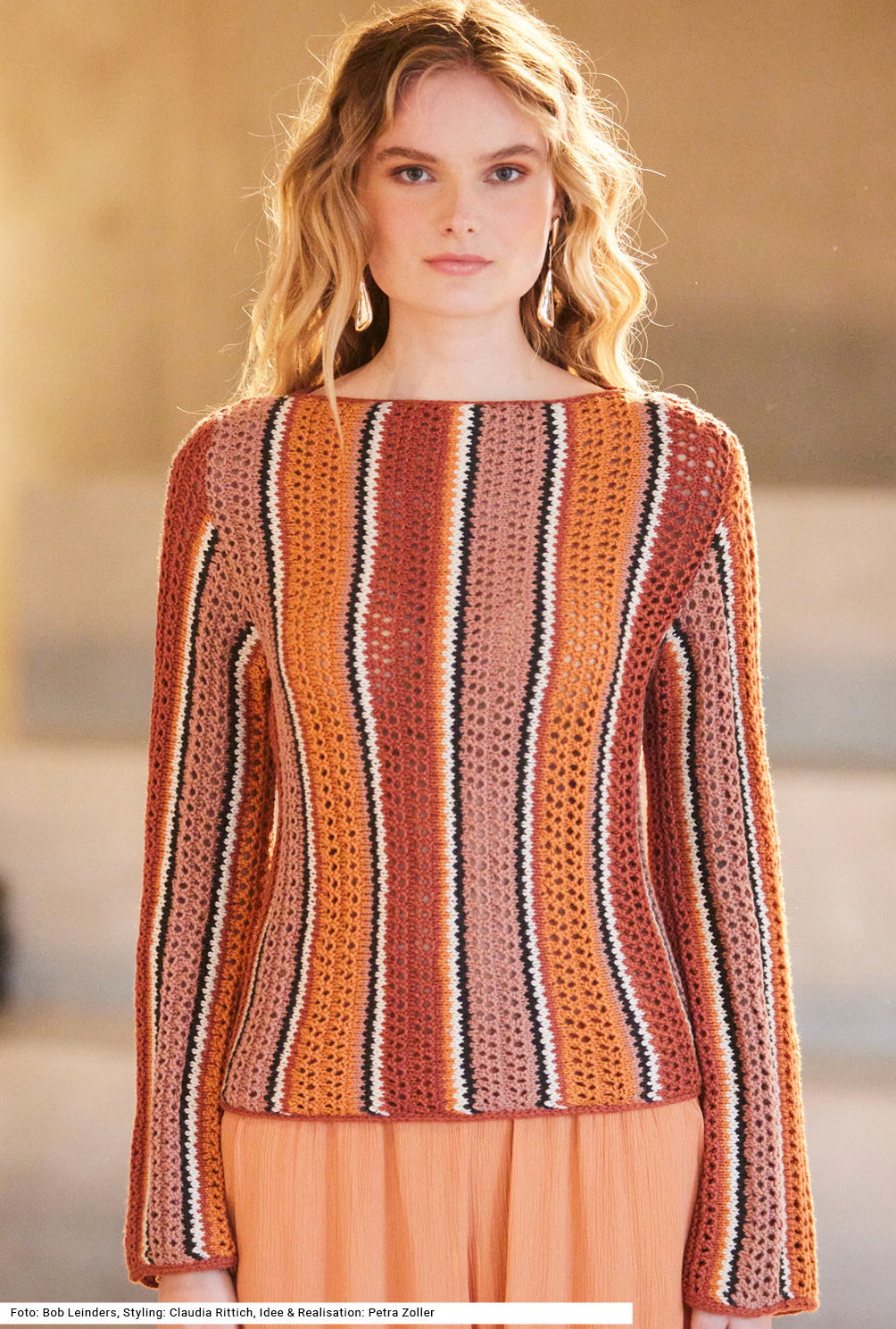 Dieser Pullover bekommt seine Dynamik, durch vertikale Streifen in vier Farben. Alle Teile des Pullis werden quer gestrickt, wobei in Vorder- und Rückenteil die Längsstreifen mit Loch- und Jacquardmuster eine schmale Silhouette zaubern. Ärmel mit Armkugel ergeben einen perfekten Sitz an den Schultern. Der U-Boot-Ausschnitt und die Ärmelränder werden zum Schluss mit einem I-Cord-Rand verziert. Das Modell wird mit einem Garn aus Baumwolle und Viskose gearbeitet. Eine Anleitung steht in den Größen 36/38, 42/44 und 46/48 zur Verfügung.