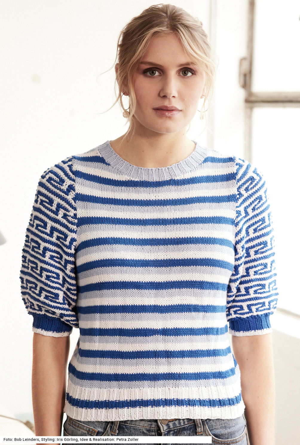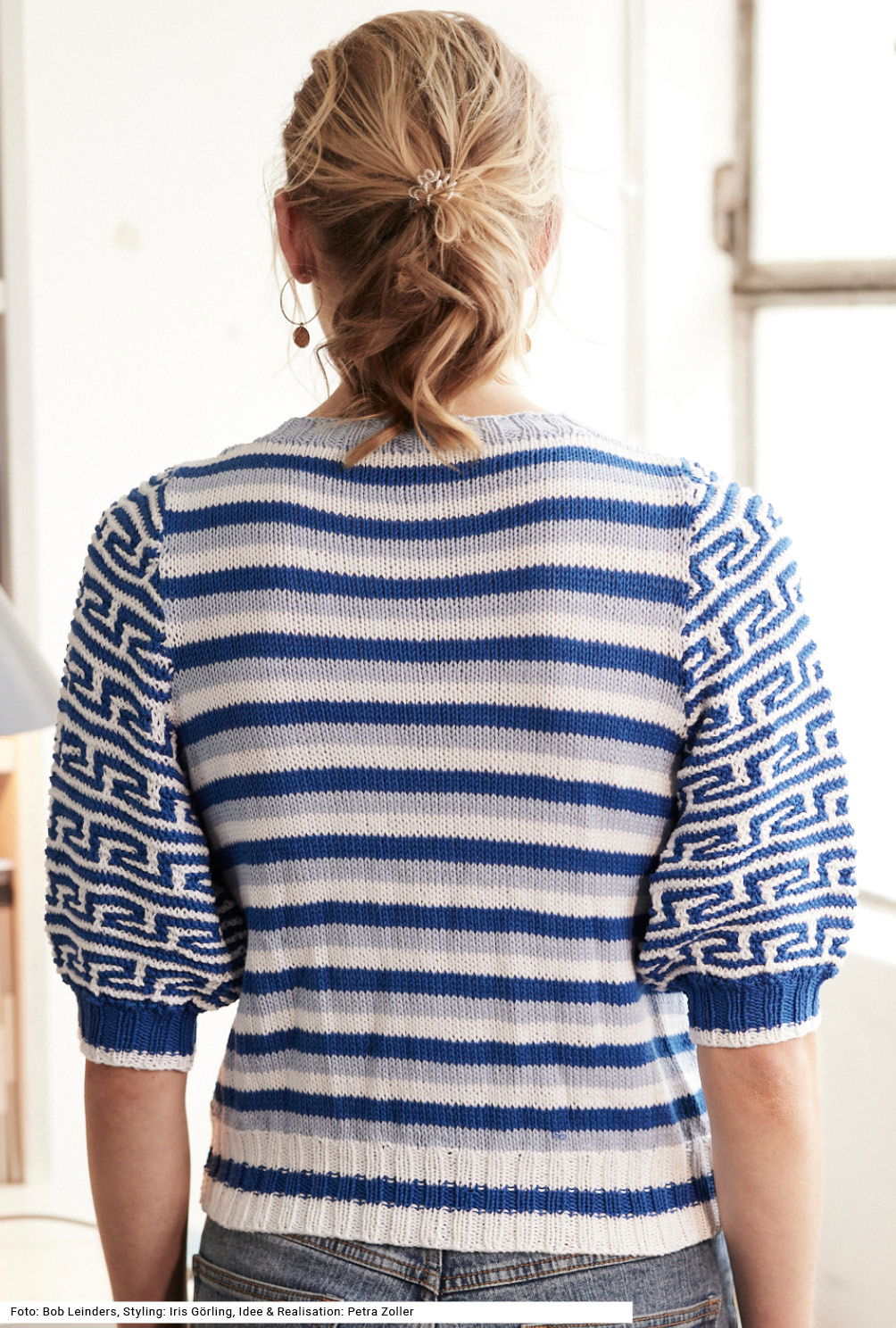 Dieser Pullover vereint Tradition und Moderne – das Hebemaschenmuster in den weit geschnittenen Ärmeln erinnert an reich verzierte Vasen aus alten Ausgrabungsstätten, die minimalistischen Streifen des Vorder- und Rückenteils geben dem Modell eine zeitgemäße Note. Für das kraus rechts gestrickte mäandernde Streifenmuster in Blau und Weiß wird stets nur mit einer Farbe gestrickt, die zweite Farbe wird einfach abgehoben. Vorder- und Rückenteil sind glatt rechts mit dunkelblauen, hellblauen und weißen Streifen gearbeitet. Die Ärmel haben eine Armkugel, das ergibt eine schöne Schulterpartie. Gestrickt wird mit Baumwolle-Soja-Garn. Die Anleitung dazu gibt es für die Größen 36/38, 40/42 und 44/46.