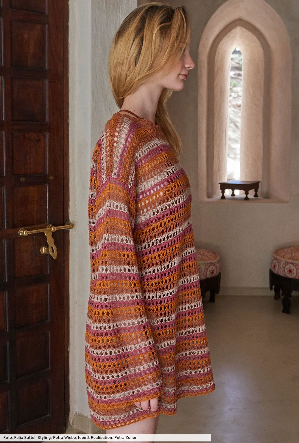 Mit dem einfachen Gittermuster und der geraden Schnittführung dieser aparten Tunika kommen auch Strickeinsteiger zum Erfolg. Der gleichmäßige Wechsel aus vier ruhigen Terrafarben verspricht Kurzweil beim Stricken und lässt das Teil schnell wachsen. Zum Schluss die elastische Rippenblende am Halsausschnitt anstricken – fertig ist ein toller Sommerbegleiter, dessen feines Leinenbändchen uns die heißen Tage gut überstehen lässt.