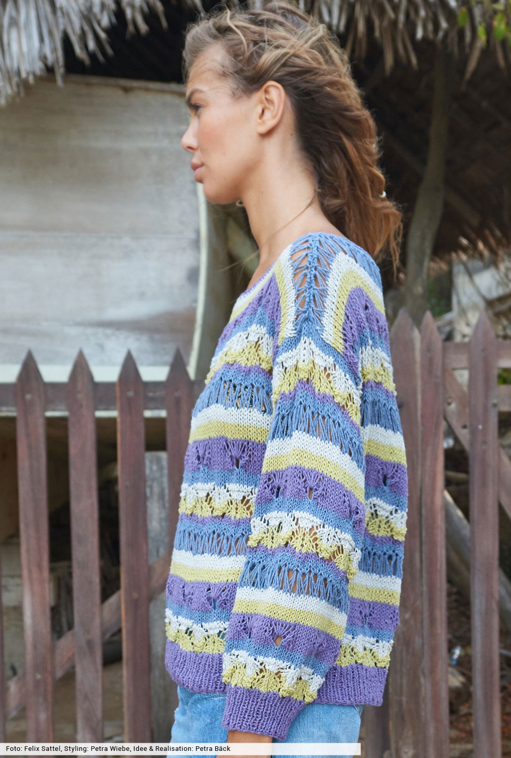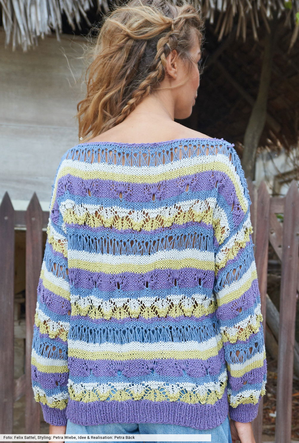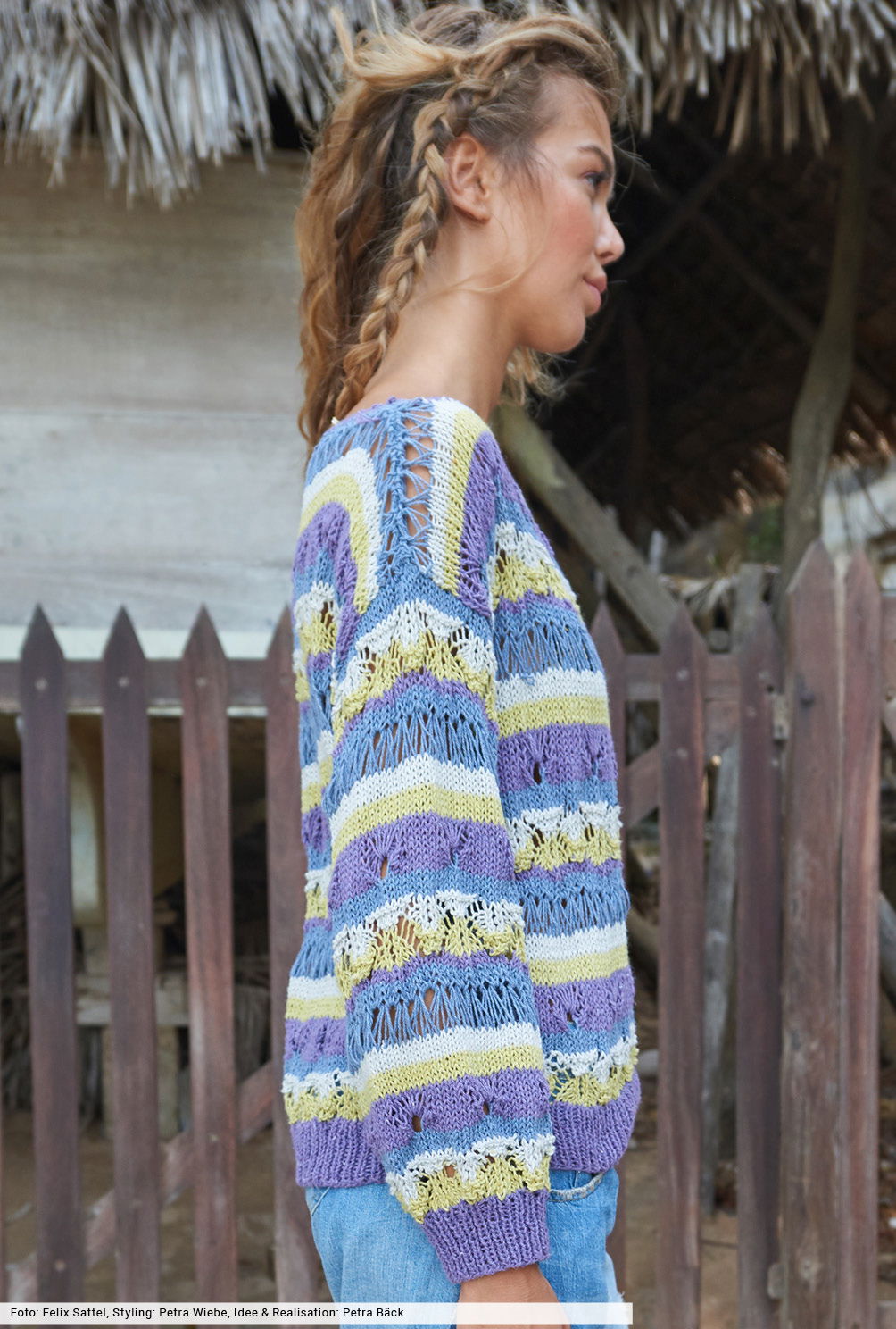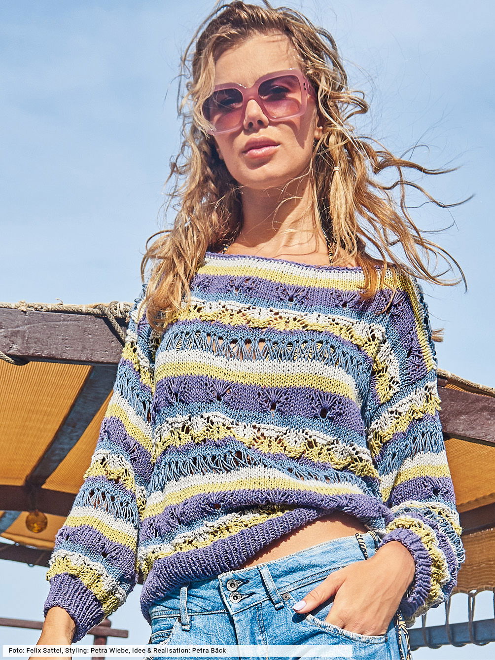 Material: PASCUALI "Re-Jeans" (95% Baumwolle, 5% sonstige Fasern, LL = 96 m/50 g) je 200 (250) 250 g Jeans (Fb 11) und Pflaume (Fb 21) sowie je 150 (200) 200 g Marmor (Fb 41) und Limone (Fb 07). Je 1 Paar CLOVER-Stricknadel Nr 3,5 und 4 sowie 1 CLOVER-Rundstricknadel Nr 3,5 und 1 CLOVER-Häkelnadel Nr 3,5.