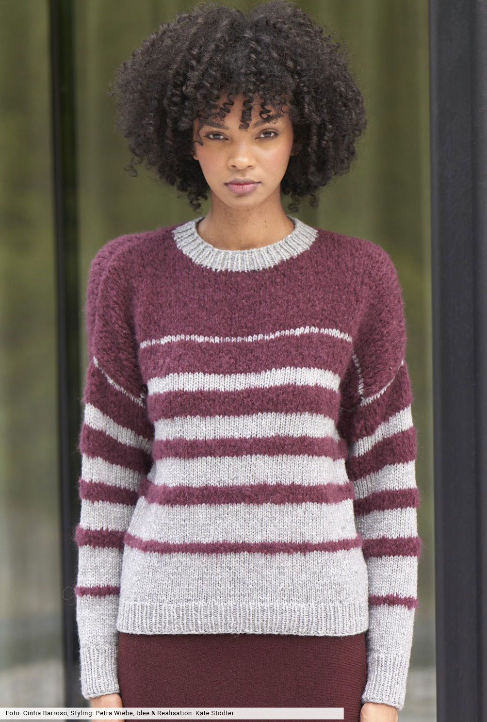 Weniger ist oft mehr: Dieser Pulli ist perfekt für Strickneulinge, da er einfach nur glatt rechts gestrickt wird und die Wirkung dem unregelmäßigen Streifenspiel in Grau und Pflaume sowie dem Materialmix aus glatter Wolle und kuscheligem Fancygarn überlässt. Dezente Seiten- und Schulterschrägungen sorgen für die perfekte Schnittführung. Elastische Rippenbündchen und die schmale Halsblende bilden den klassischen Rahmen. Unser Fazit: ein Look, der Strickmode neu definiert.