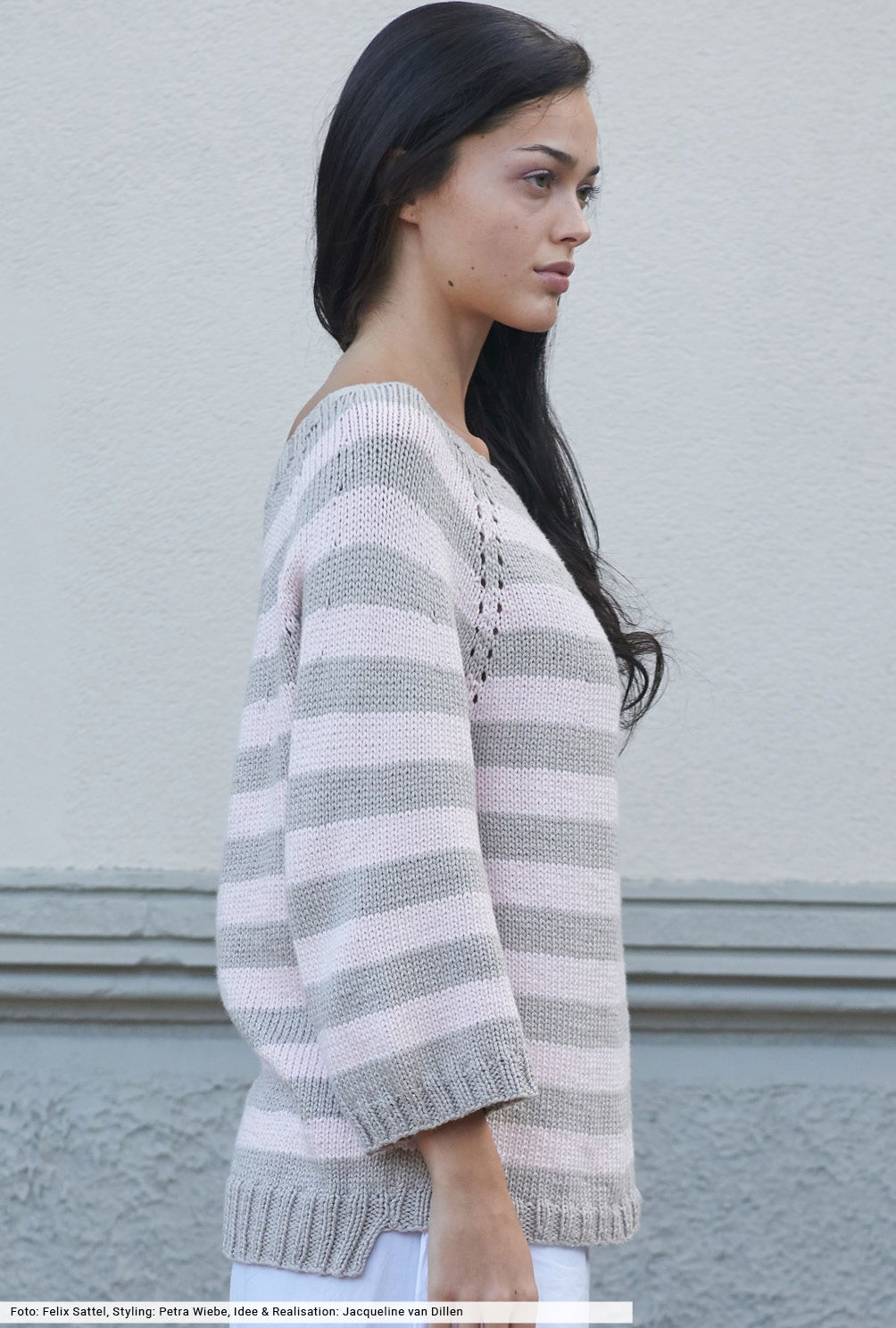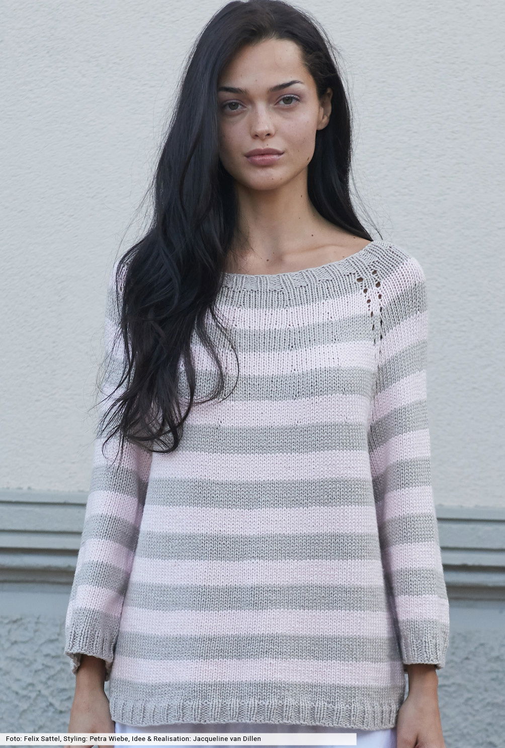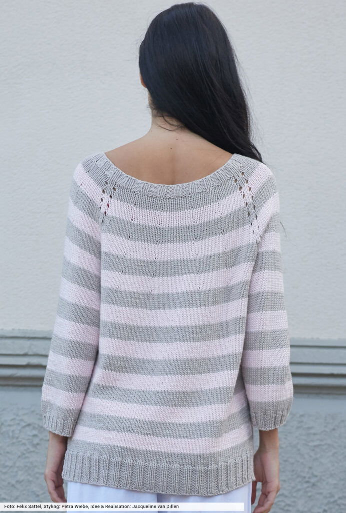 Gebe deinen Outfits Raum zum Atmen – mit entspannten Styles, die Gelassenheit versprühen. Wie dieser Raglanpulli, der schlicht glatt rechts verstrickt wird und durch den regelmäßigen Wechsel aus grauen und rosafarbenen Streifen für Abwechslung sorgt. Eines der wenigen, aber effektvollen Details sind die schmalen Lochreihen, die den Raglanschrägungen die Richtung weisen. Schmale Rippenbünchen und die Blende am halsfernen Ausschnitt halten alles schön in Form.