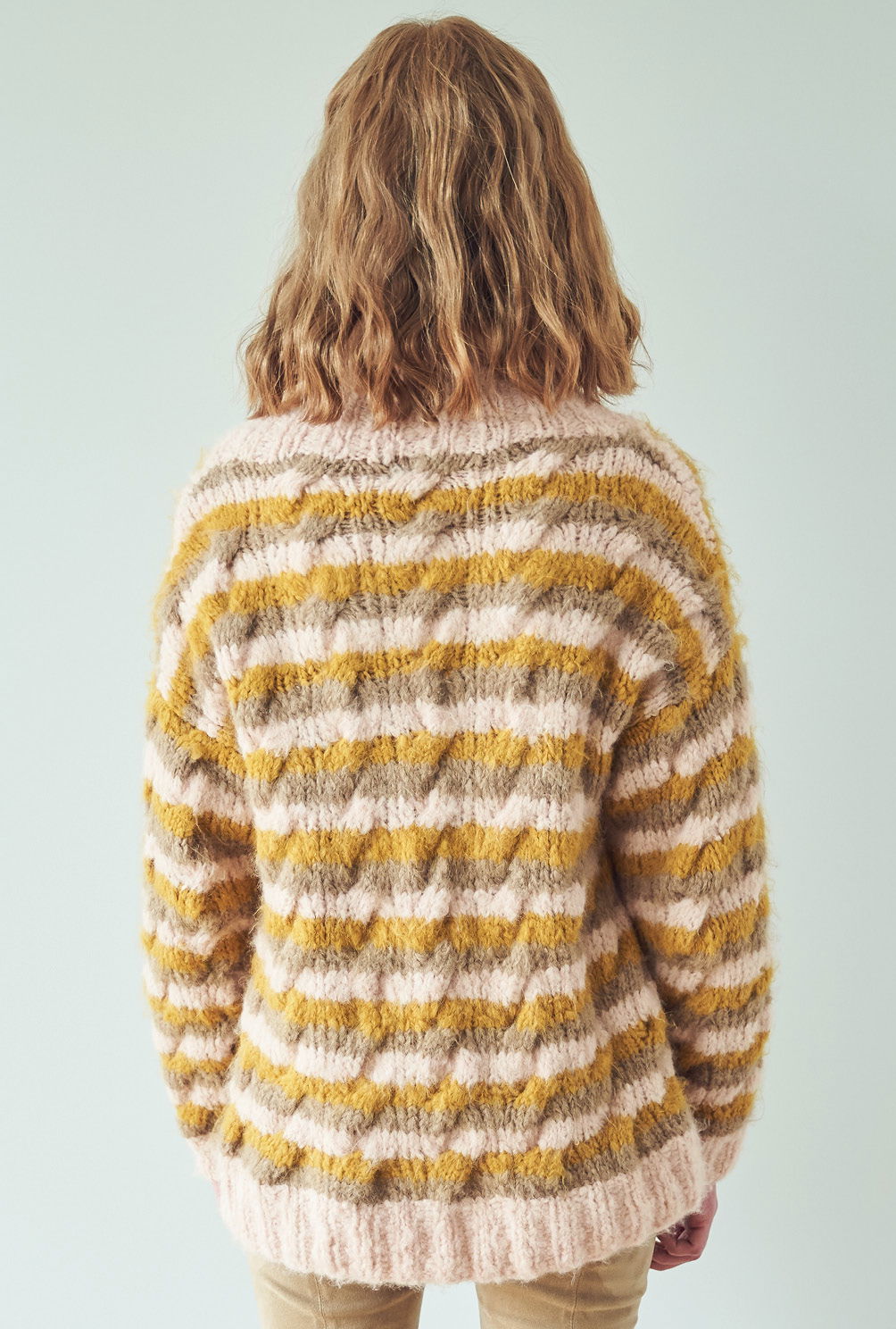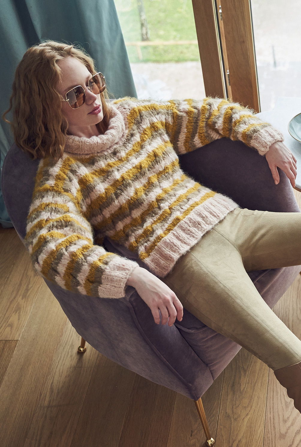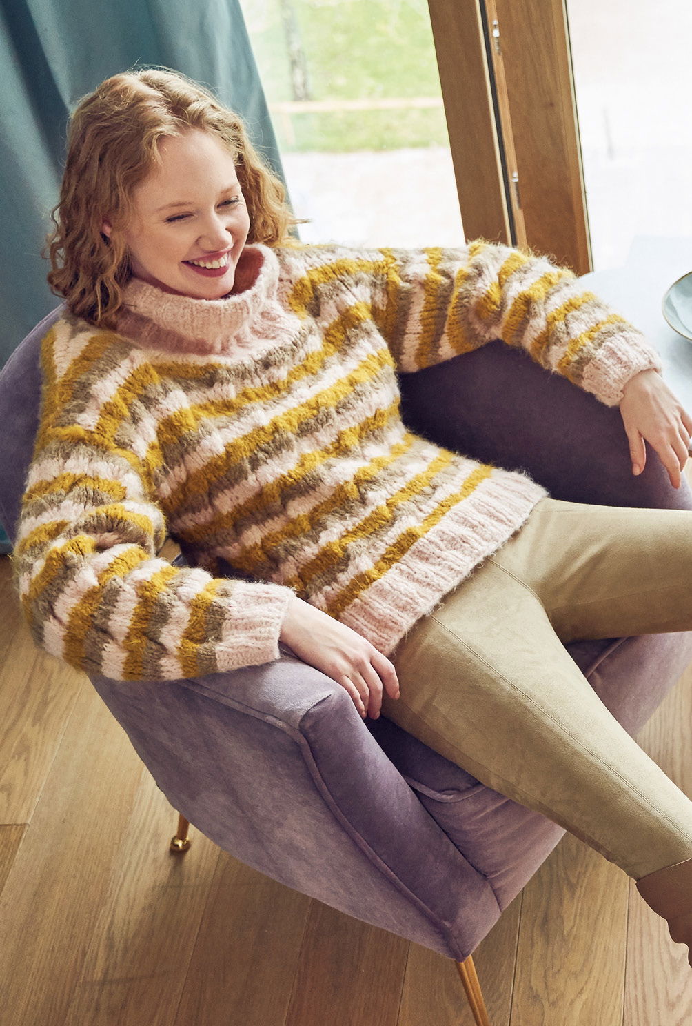 Kuschelweich und wunderbar entspannend: Das Flauschgarn steht für pures Wohlgefühl und zeigt, wie die extravagante Farbkombination aus Ocker, Rosa und Taupe streifenweise miteinander harmoniert. Das kleine Zopfmuster verbindet alles gekonnt. Die Zöpfe sind auch gar nicht kompliziert zu stricken und in der Anleitung detailliert Reihe für Reihe beschrieben. Gestrickt werden alle Teile einzeln und von unten nach oben. Sind alle vier Teile fertig gestrickt, werden noch alle Nähte geschlossen und aus dem Halsausschnitt Kragen herausgestrickt. Mit Nadelstärke 7 alles in allem ein kurzweiliges Strickvergnügen, bei dem man stets in Versuchung ist, bereits über die nächste Farbkombination nachzudenken!