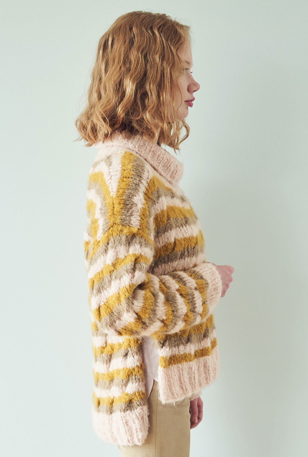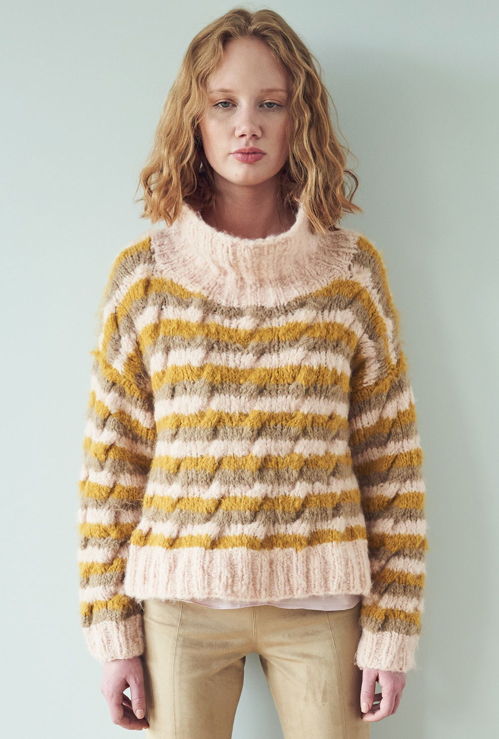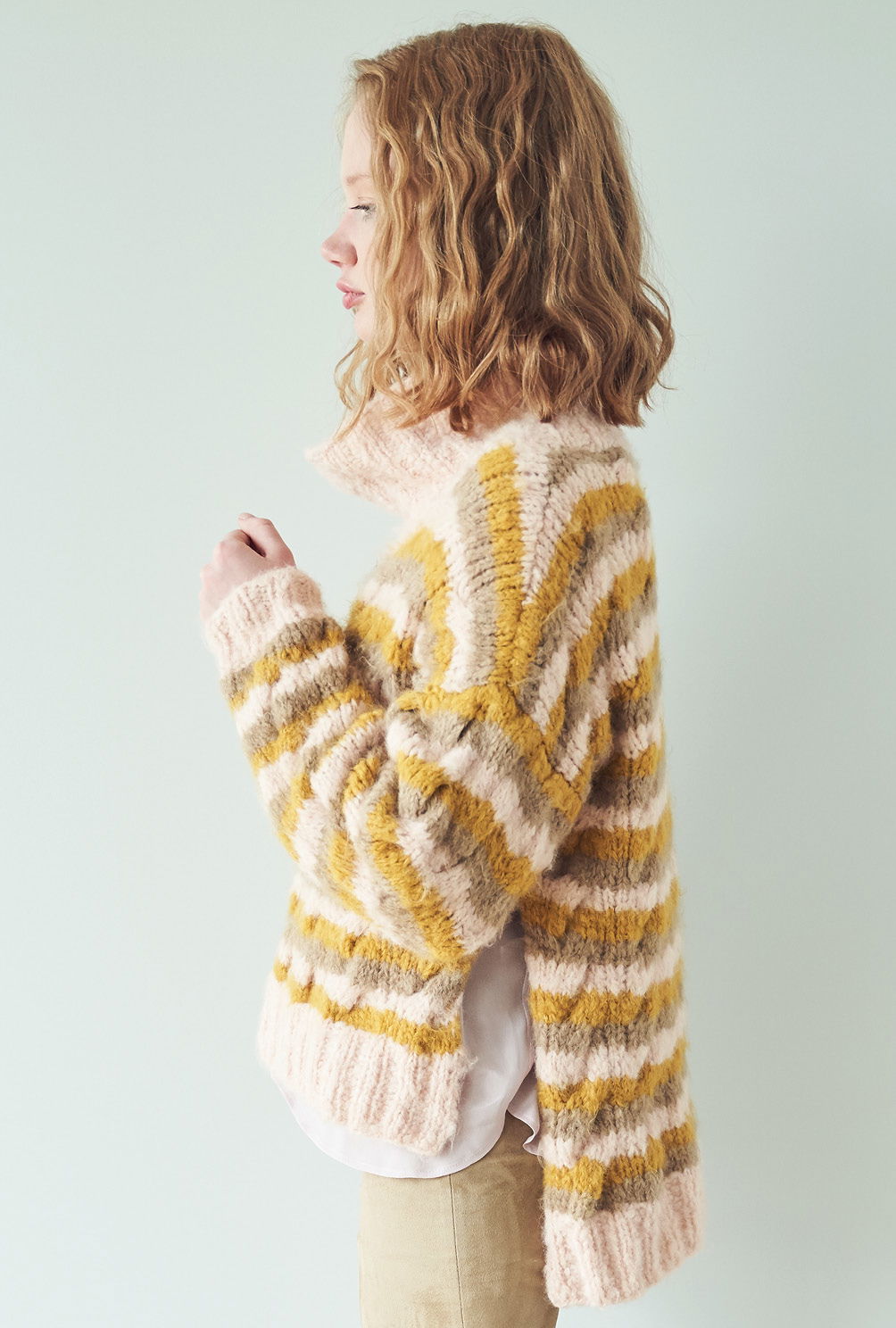 Kuschelweich und wunderbar entspannend: Das Flauschgarn steht für pures Wohlgefühl und zeigt, wie die extravagante Farbkombination aus Ocker, Rosa und Taupe streifenweise miteinander harmoniert. Das kleine Zopfmuster verbindet alles gekonnt. Die Zöpfe sind auch gar nicht kompliziert zu stricken und in der Anleitung detailliert Reihe für Reihe beschrieben. Gestrickt werden alle Teile einzeln und von unten nach oben. Sind alle vier Teile fertig gestrickt, werden noch alle Nähte geschlossen und aus dem Halsausschnitt Kragen herausgestrickt. Mit Nadelstärke 7 alles in allem ein kurzweiliges Strickvergnügen, bei dem man stets in Versuchung ist, bereits über die nächste Farbkombination nachzudenken!