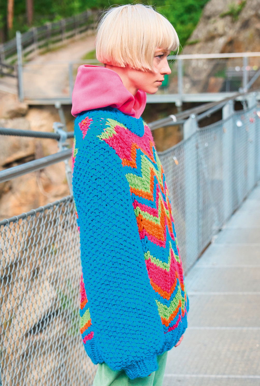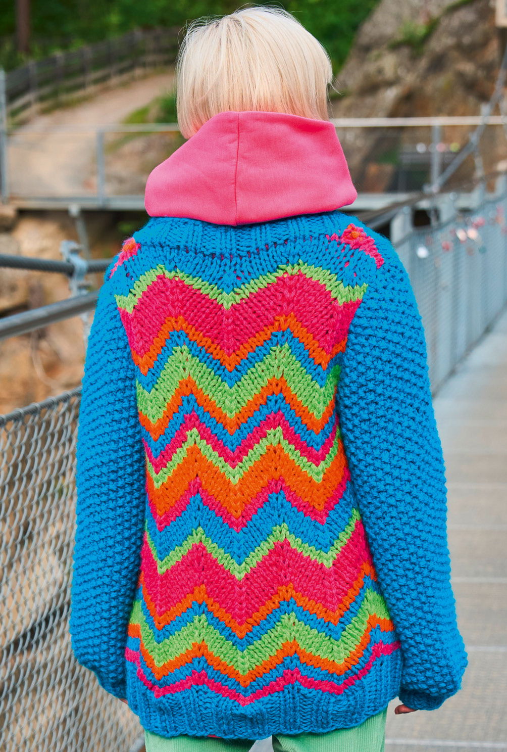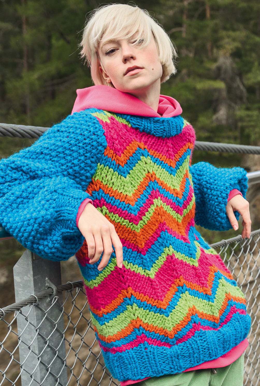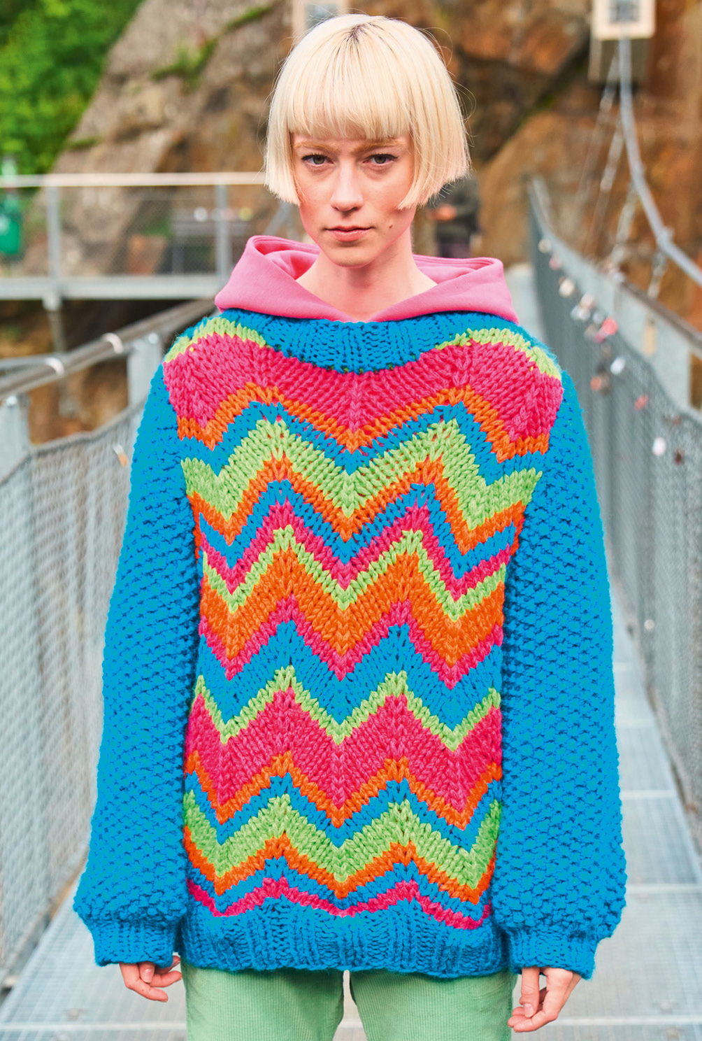 Das farbenfrohe Zackenmuster dieses tollen Pullis kommt nur bei Vorder- und Rückenteil zum Einsatz. Wir haben es in unserer Anleitung ohne Strickschrift genau beschrieben, so du dich gut daran orientieren kannst. Die markanten Perlmuster-Strukturen sind den Ärmeln vorbehalten, elastische Rippen für Bündchen und Halsblende bilden den klassischen Rahmen. Mit 12er-Nadeln kommst du ruckzuck zum Ziel und kannst dich an diesem wärmenden Winterbegleiter aus dickem Schurwoll-Alpakagarn auch noch in der nächsten Saison erfreuen.