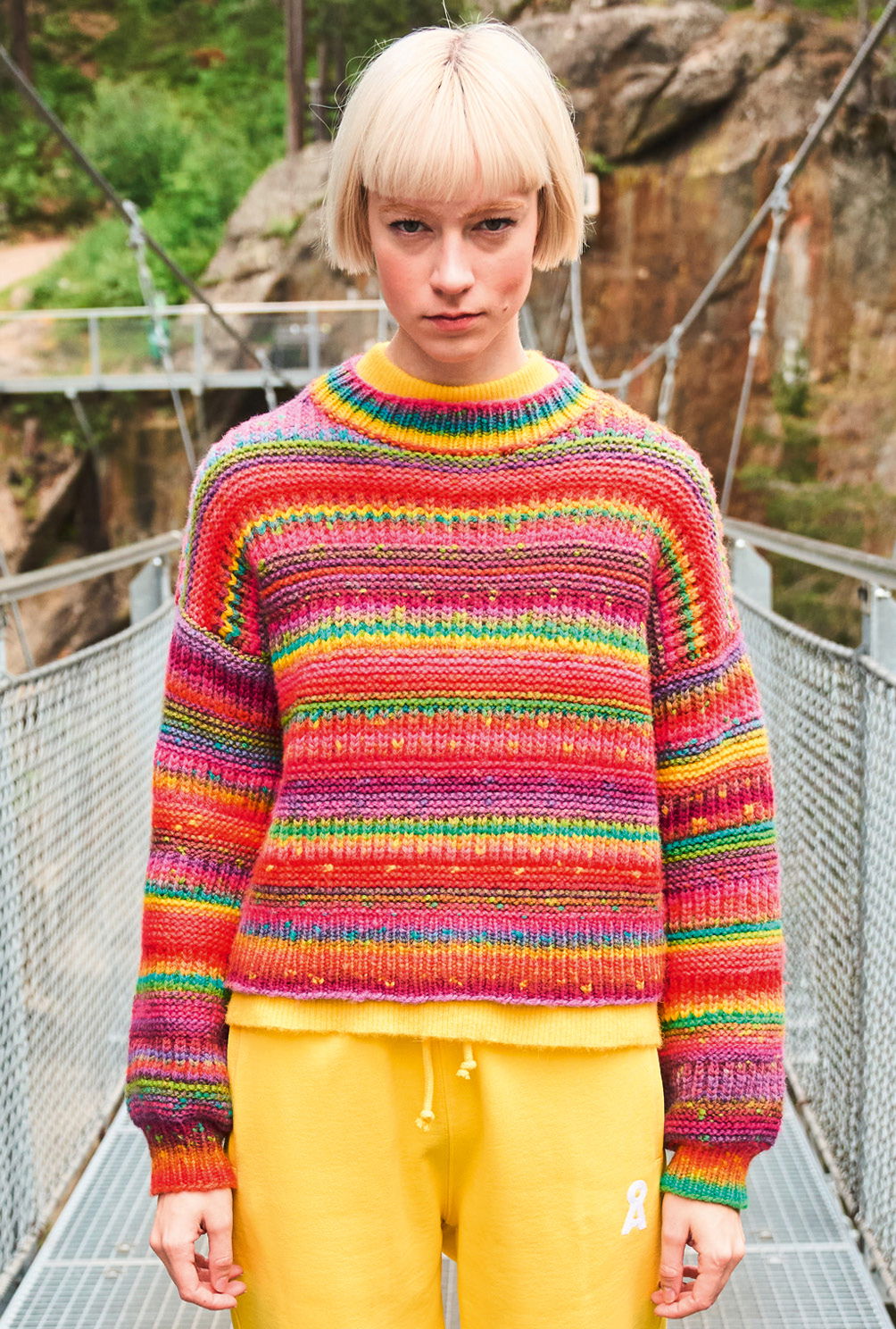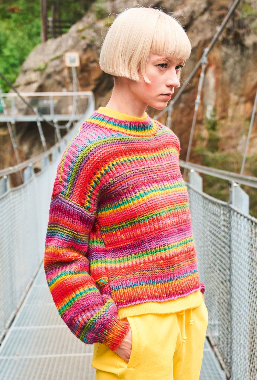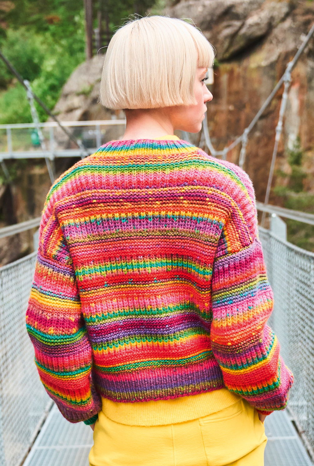 Je bunter, je besser: Von Pink über Lila bis hin zu Gelb sorgt dieses Farbverlaufsgarn an grauen Tagen für gute Stimmung. Und das geht schon beim Stricken los, denn der Wechsel aus Streifen im Halpbatentmuster und kraus rechts geht flott von der Nadel und ist nicht allzu schwer, sodass auch weniger versierte Strickerinnen zum Erfolg kommen. Das Ergebnis ist ein klassisch geschnittener, mit Rippenbündchen versehener Pulli, der im Nu deine Wintergarderobe bereichert.