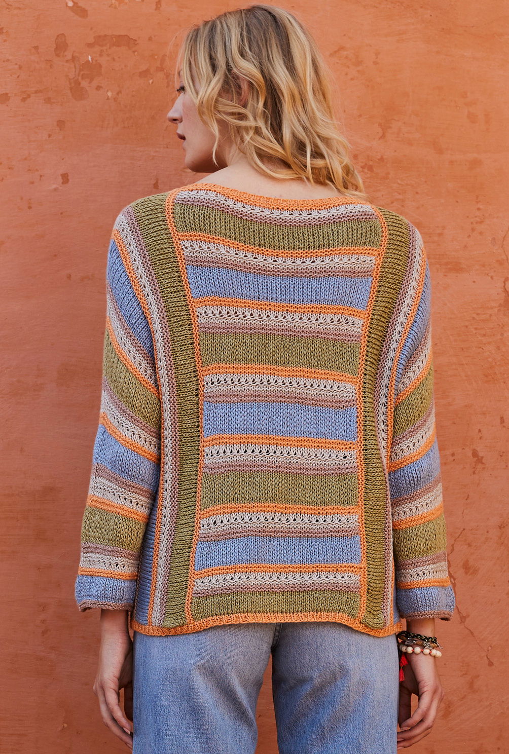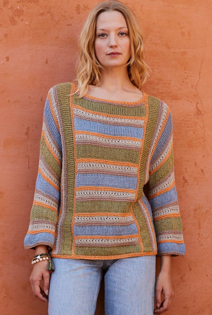 Mal längs, mal quer: Das gleichmäßige Streifenspiel aus fünf Farben wird zunächst für Vorder- und Rückenteil von unten nach oben gestrickt. Danach fasst du für die Seitenteile aus den Kanten die Maschen auf und arbeitest, inklusive der Schulterschrägungen, bis zu den unteren Ärmelkanten alles an einem Stück. Um diesem aparten Pulli die perfekte Form zu geben, werden zum Schluss die Saumkanten und der Halsausschnitt mit einer schmalen Blende im elastischen Rippenmuster einfasst.