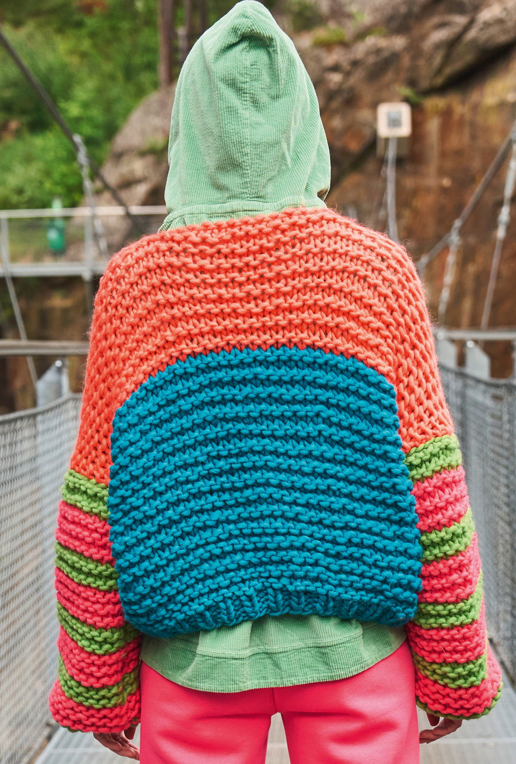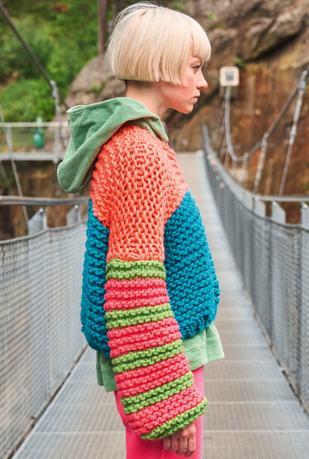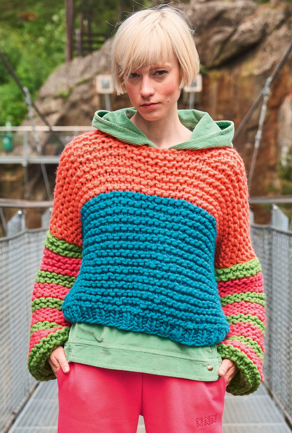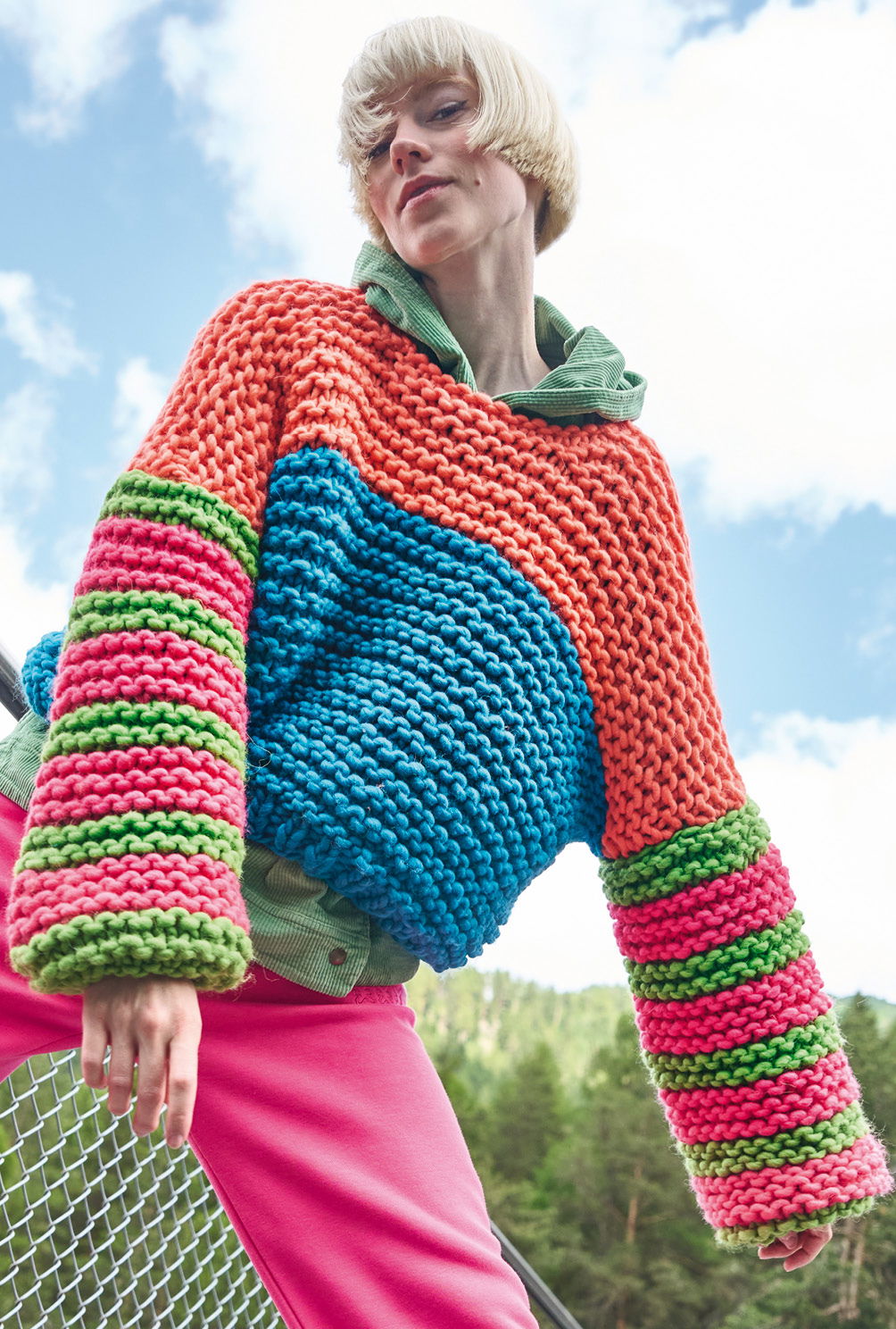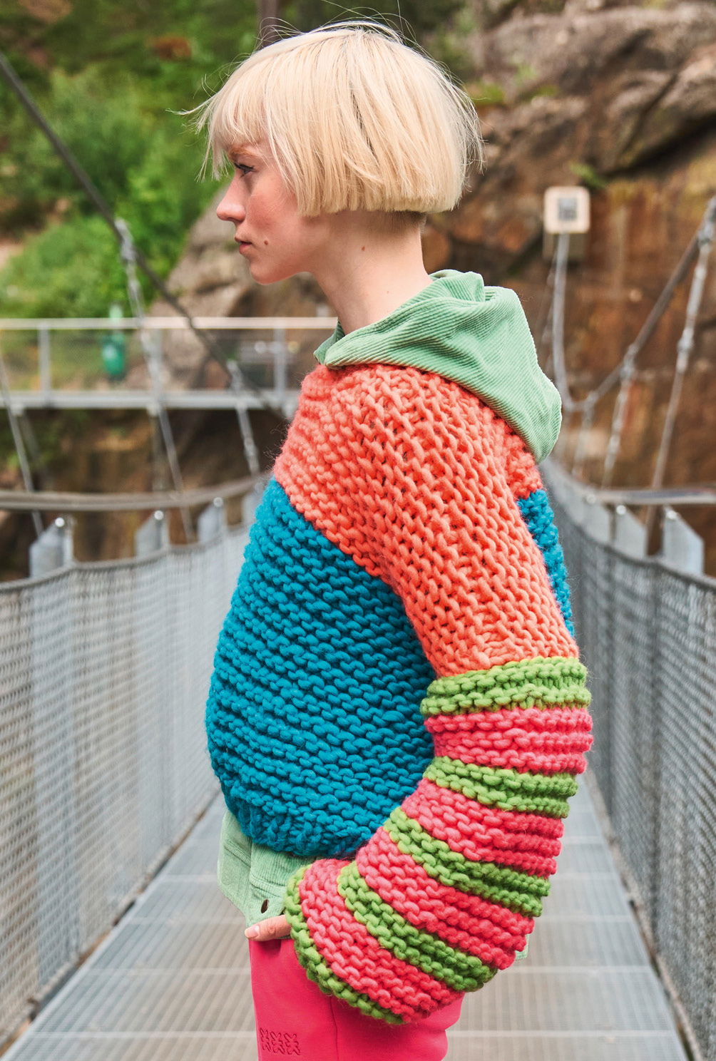 Geht es in diesem Winter ums Thema Warmhalten, haben Grobstrickgarne ihren ganz großen Auftritt. Mit Nadel Nummer 15 kommen die Kraus-rechts-Streifen dieses lässigen Pullis besonders plastisch zur Geltung. Leuchtende Farben wie Türkis, Pink, Grün und Koralle sind Stimmungsbooster, die wir jetzt gut brauchen können. Wir haben sie für den Korpus in breiten Flächen, für die Ärmel in schmalen Streifen angelegt. Schmale Rippenblenden aus dünneren Nadeln geben diesem Pulli die modische Boxy-Form.
