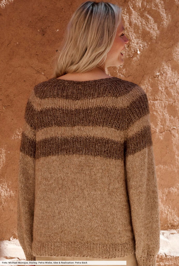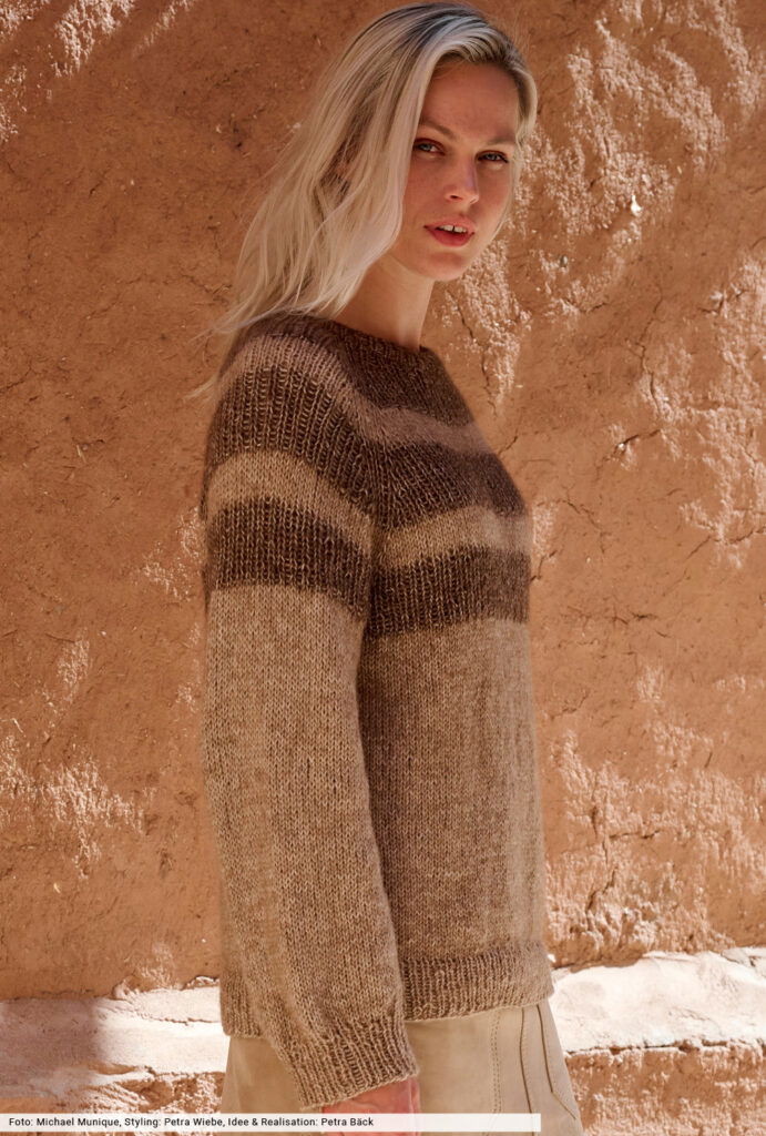 Mocha Mousse dokumentiert, wie spannend warme Töne auch in Kombination miteinander sein können. Hier wird eine helle Natur-Nuance mit tiefem Schokobraun zu einem tollen Pulli verstrickt, bei dem vorallem die gestreifte Passe ins Auge fällt. Ein großes Plus für alle, die nicht gerne konfektionieren: Hier spart man sich das Zusammennähen der Seitennkanten, da die Arbeit am Hals begonnen wird und nahtlos an den Bündchen endet.